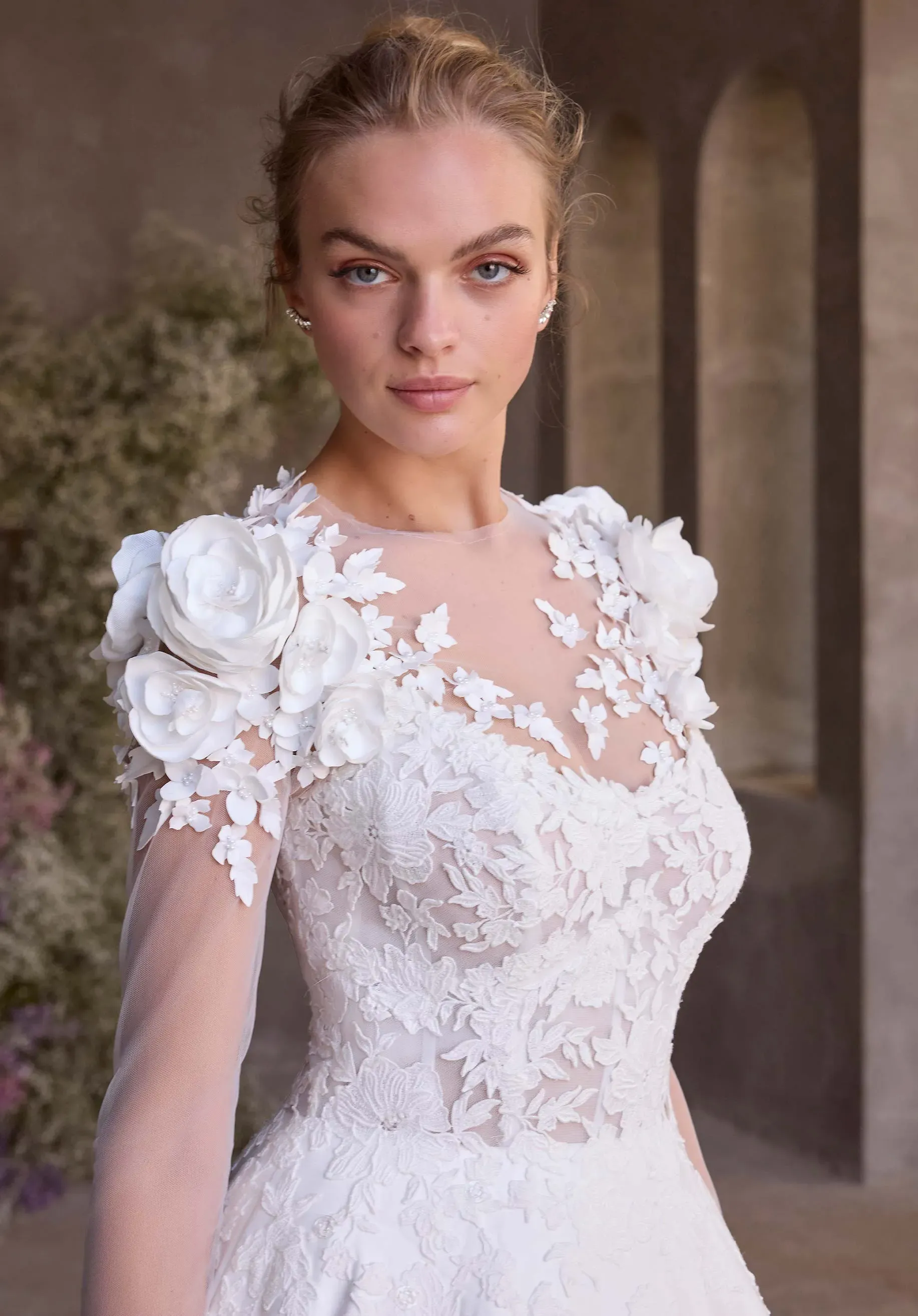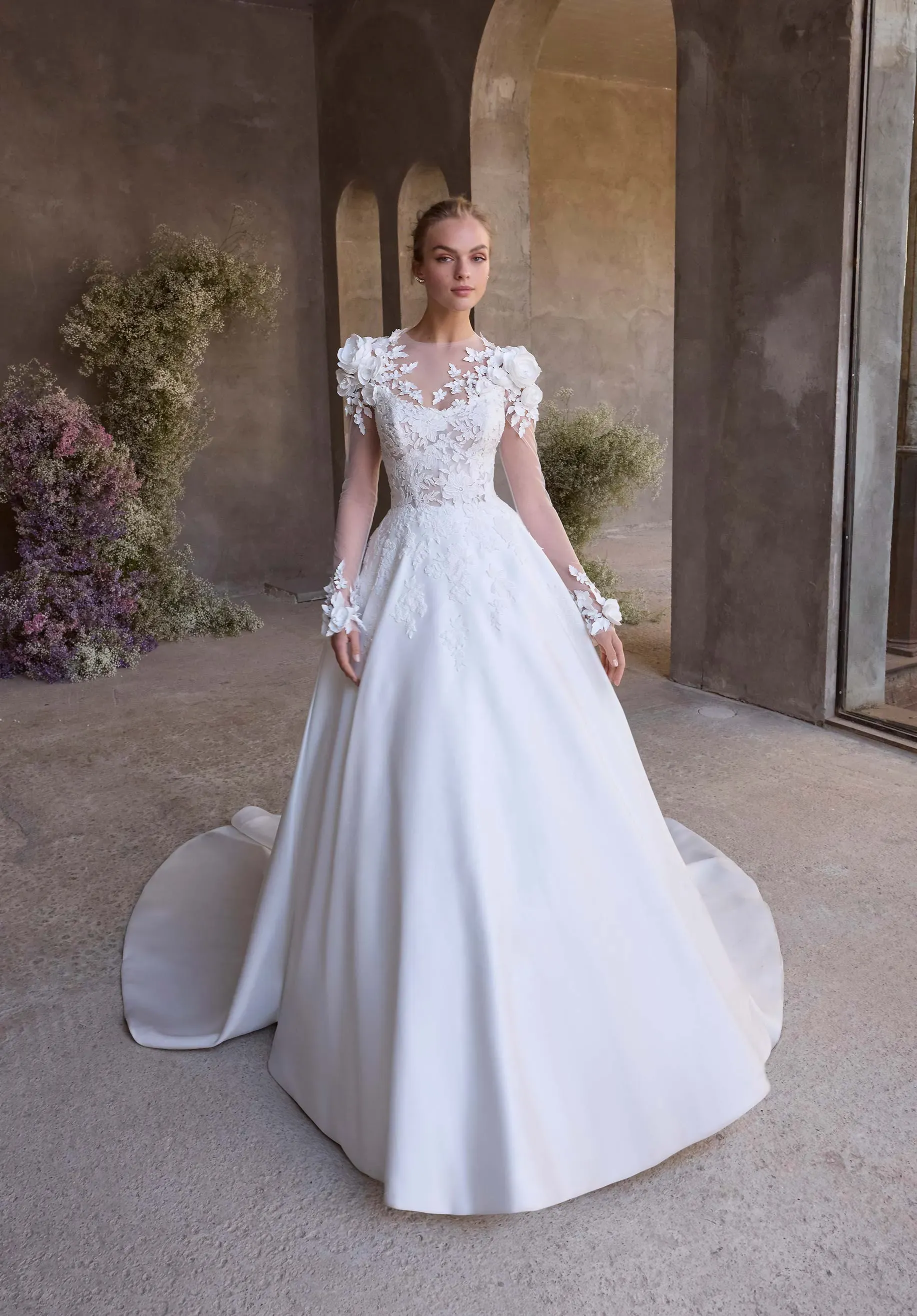 Our Clio wedding dress is a fresh take on classic grandeur. The gown has a stylized scoop, cat eye neckline on a lace bodice that blends structure with softness. Lace appliqués trail onto the satin ball gown skirt, while a detachable 3D flower adds a dramatic accent. Shown with our Hand Cut Floral Tulle T Shirt, sold separately as Style 1631.