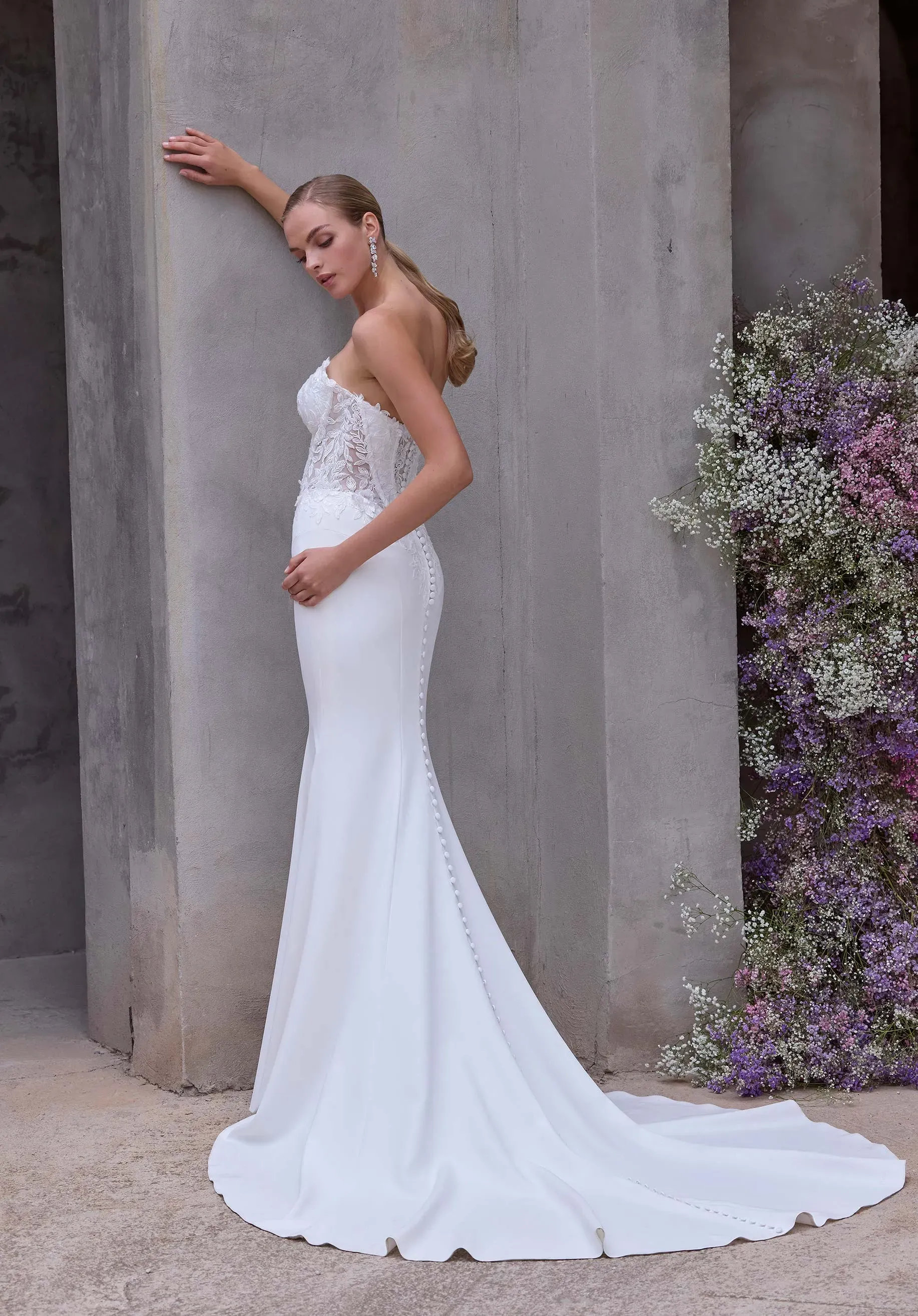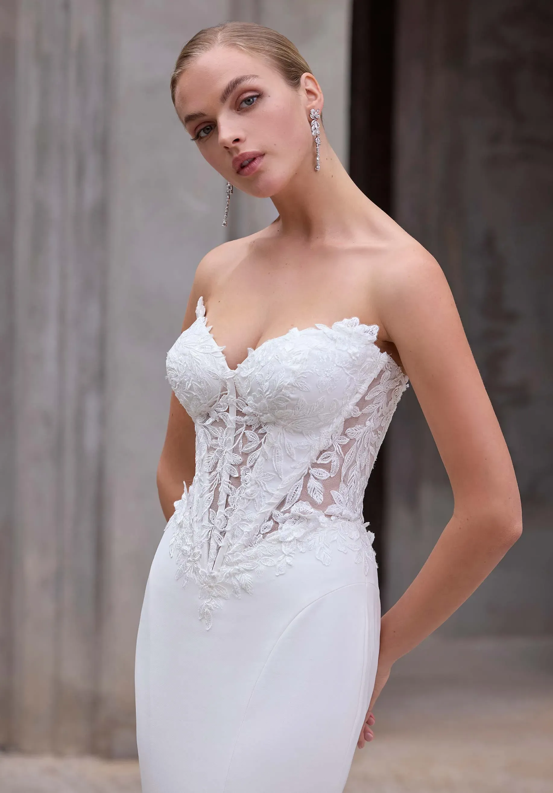 Architectural romance with a modern edge, our Hypatia wedding dress has a strapless cat-eye neckline on an illusion cut-out bodice. Exposed boning leads to a basque waist that sculpts the silhouette, beautifully blending structure and allure. Sequin highlighted floral appliqués soften the sleek crepe fit and flare, flowing into a minimalist train. The dress is available without the pearl drape as Style 2921D.