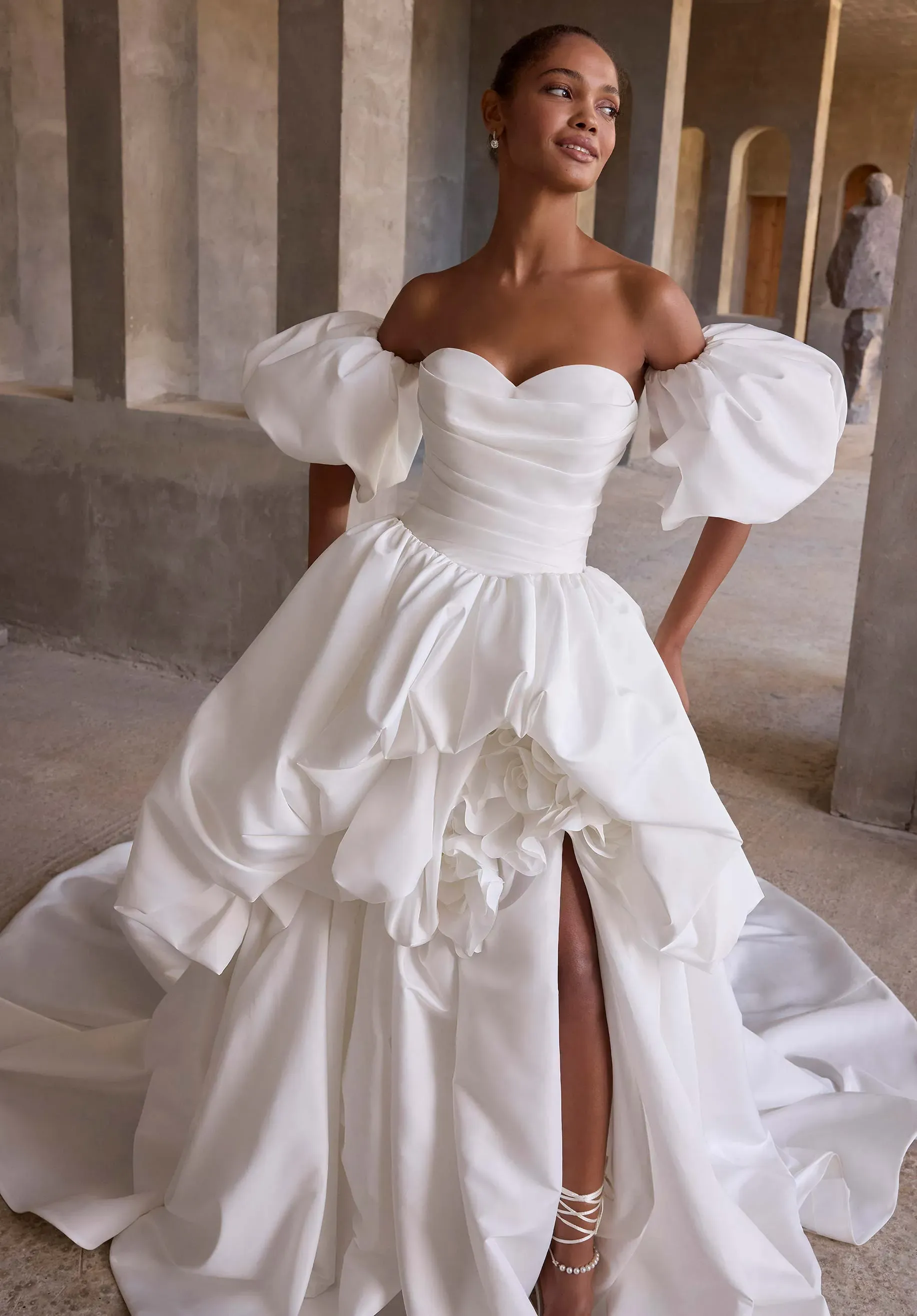 Our Nereida wedding dress is voluminous and romantic with a couture edge. The gown features a strapless draped bodice and basque waist to define the silhouette, accented by detachable puff sleeves and scattered three-dimensional floral details. Crafted in crisp taffeta, the A-line ball gown is finished with a dramatic bubble hem overskirt that's transformative, textural, and undeniably bold. This dress is available without the bubble hem overskirt as Style 2930D. Taffeta Bubble Hem Peplum also sold separately as Style 11627.