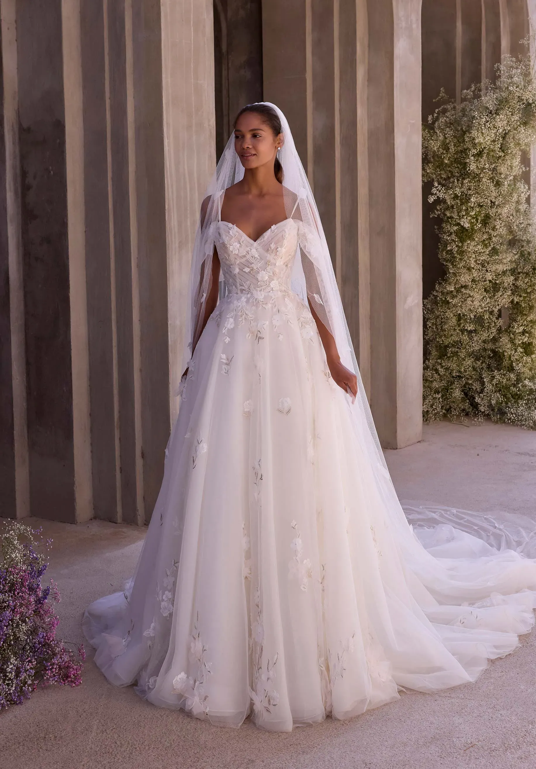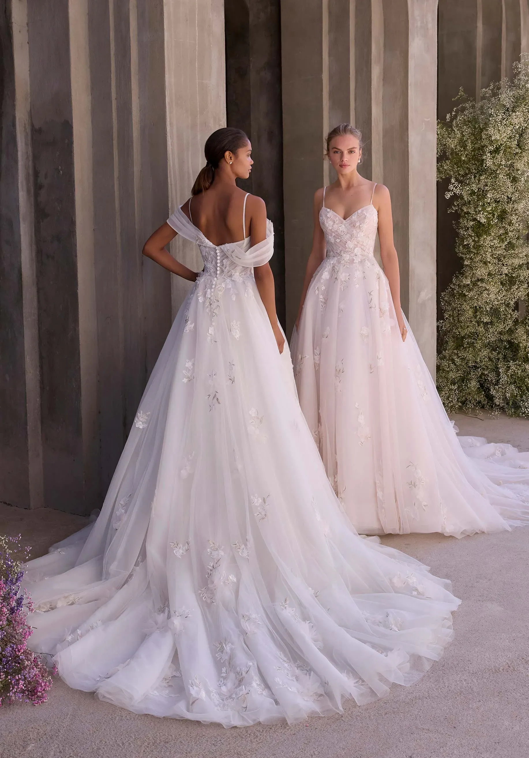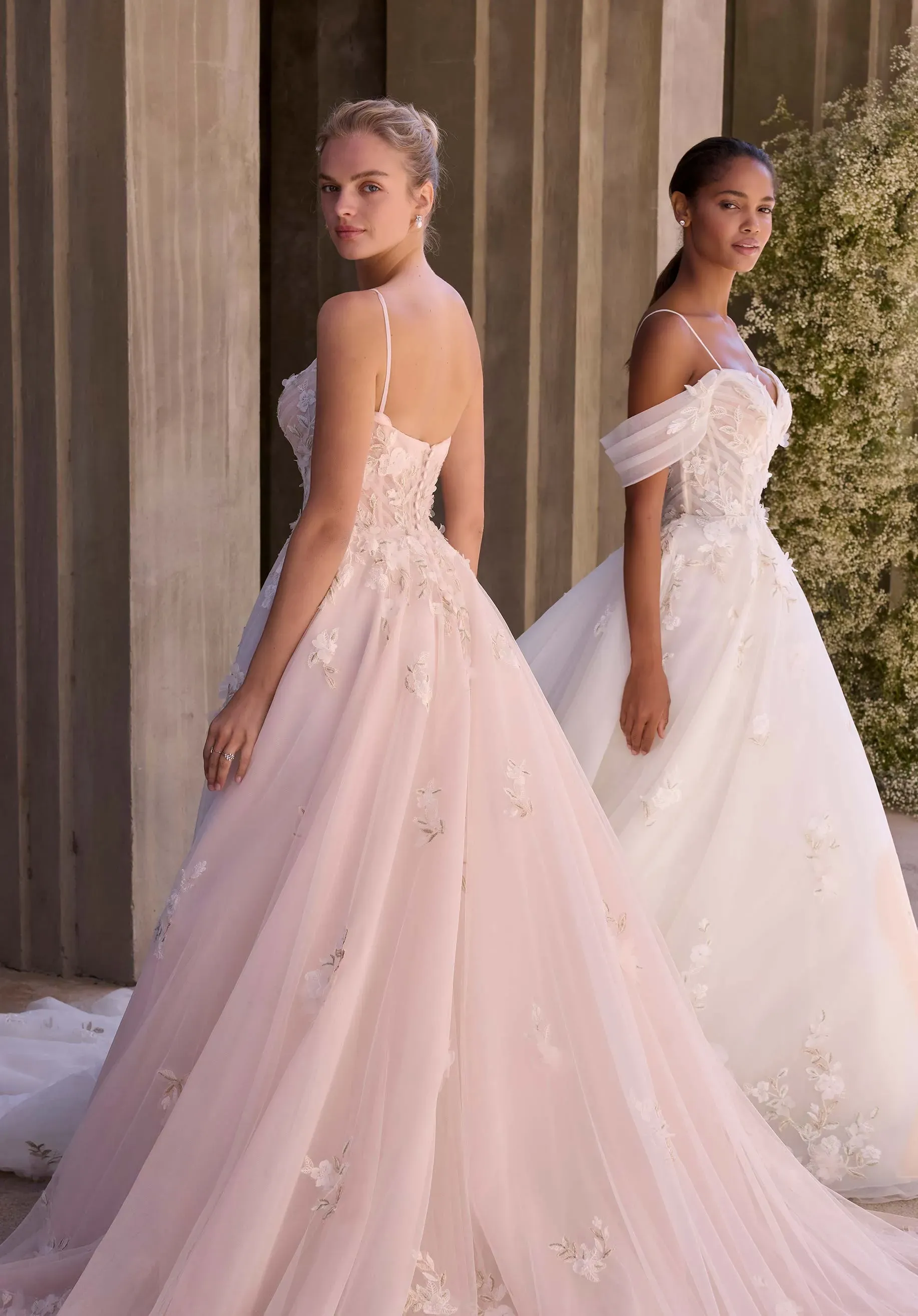 Our Morrigan wedding dress is ethereal and whimsical featuring a draped sweetheart neckline with slender straps and paired with a detachable off-the-shoulder drape for soft structure. Crafted in floral threadwork, embroidered tulle, the A-line silhouette floats into a sweeping train, finished with a detachable tie-ribbon bow for a gown that feels delicately bold. Shown in Ivory/Blush and Ivory/Champagne.