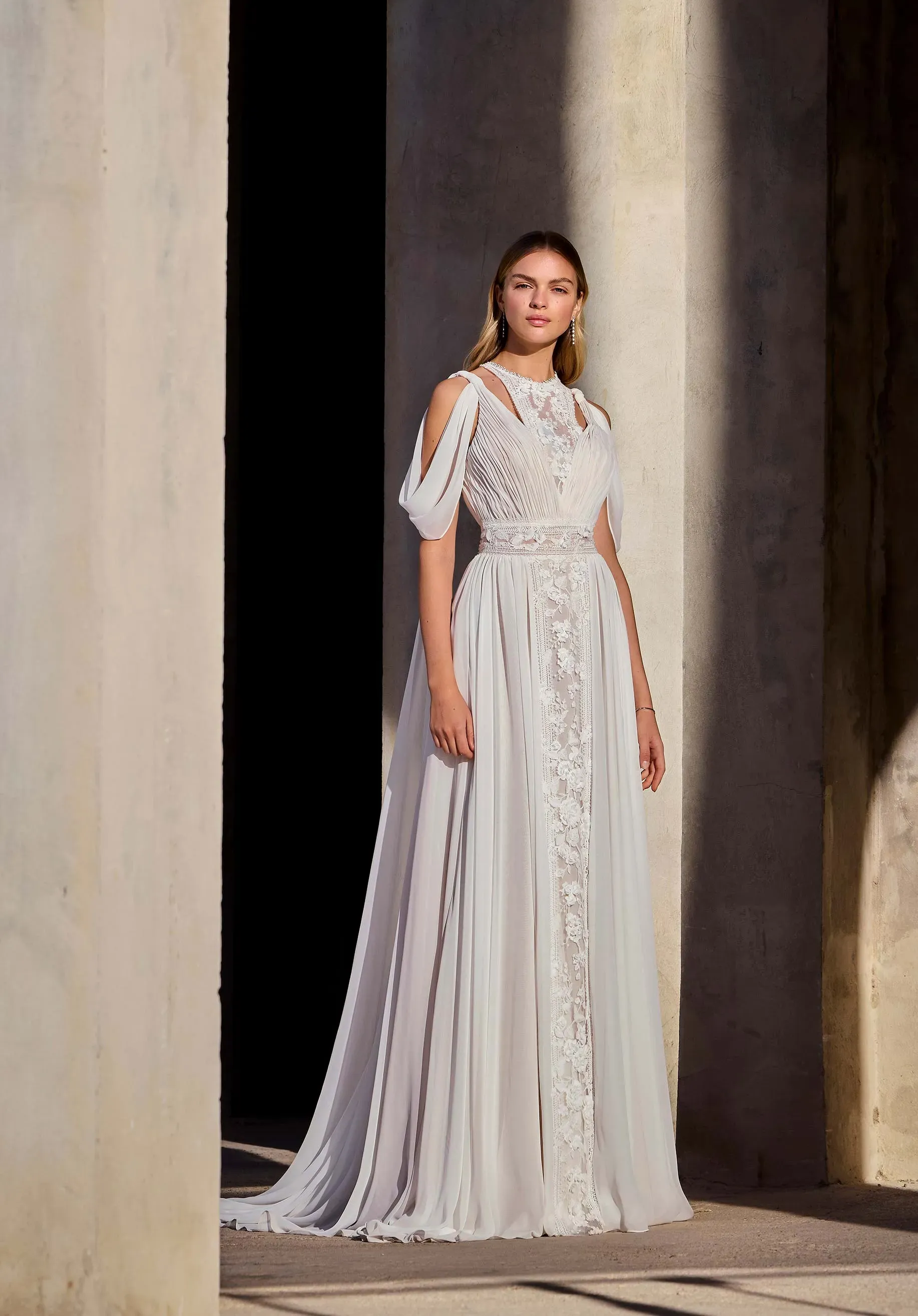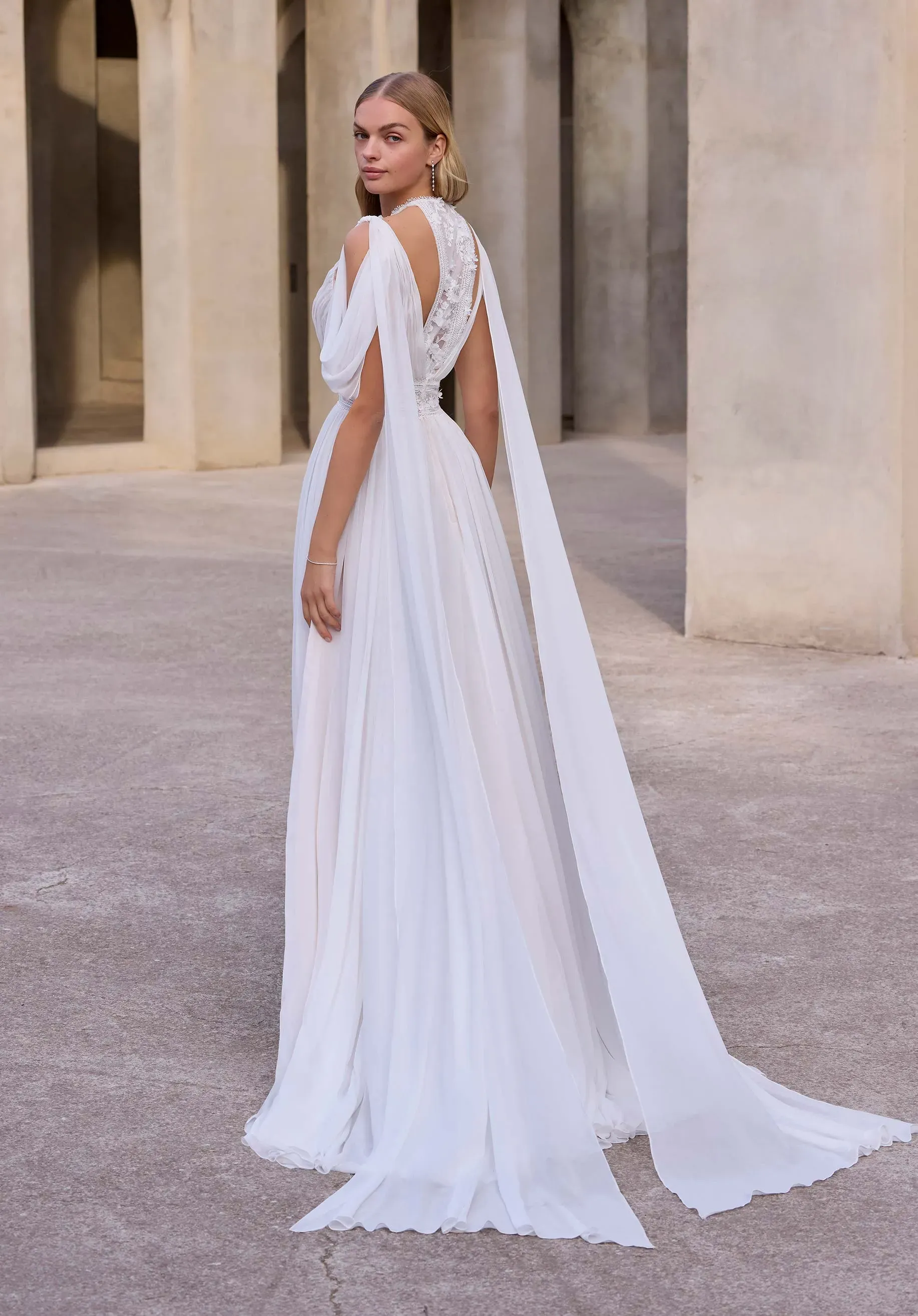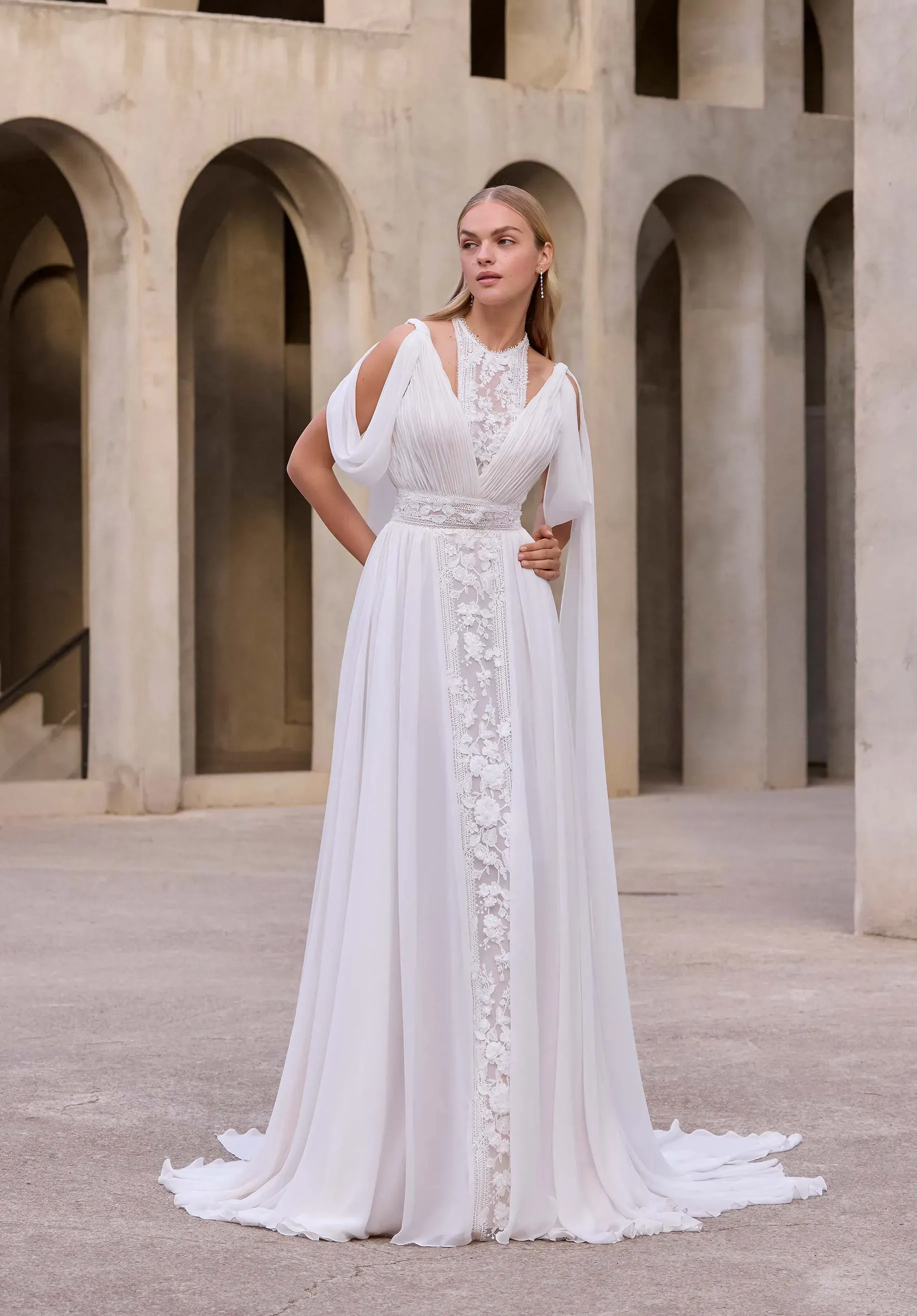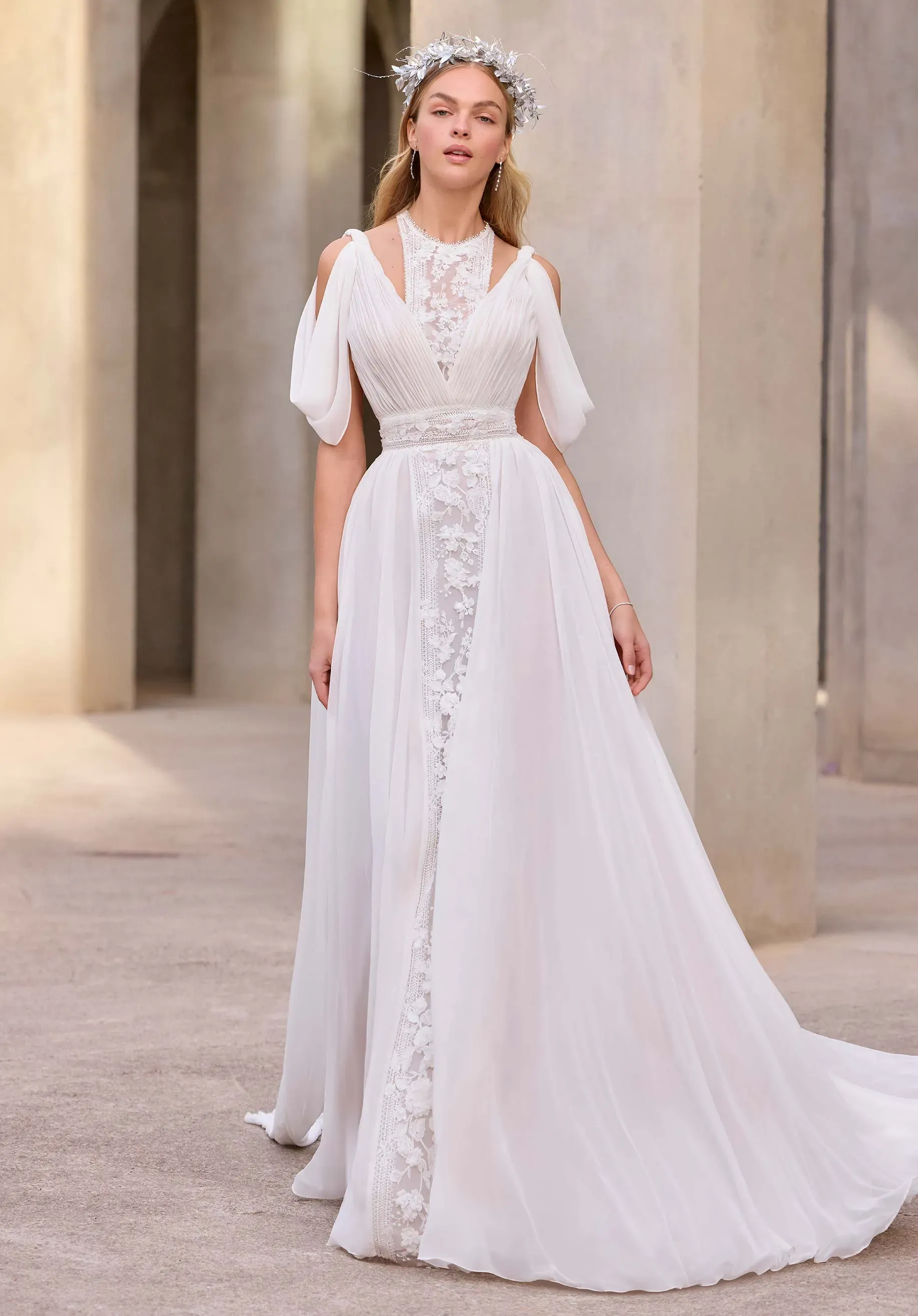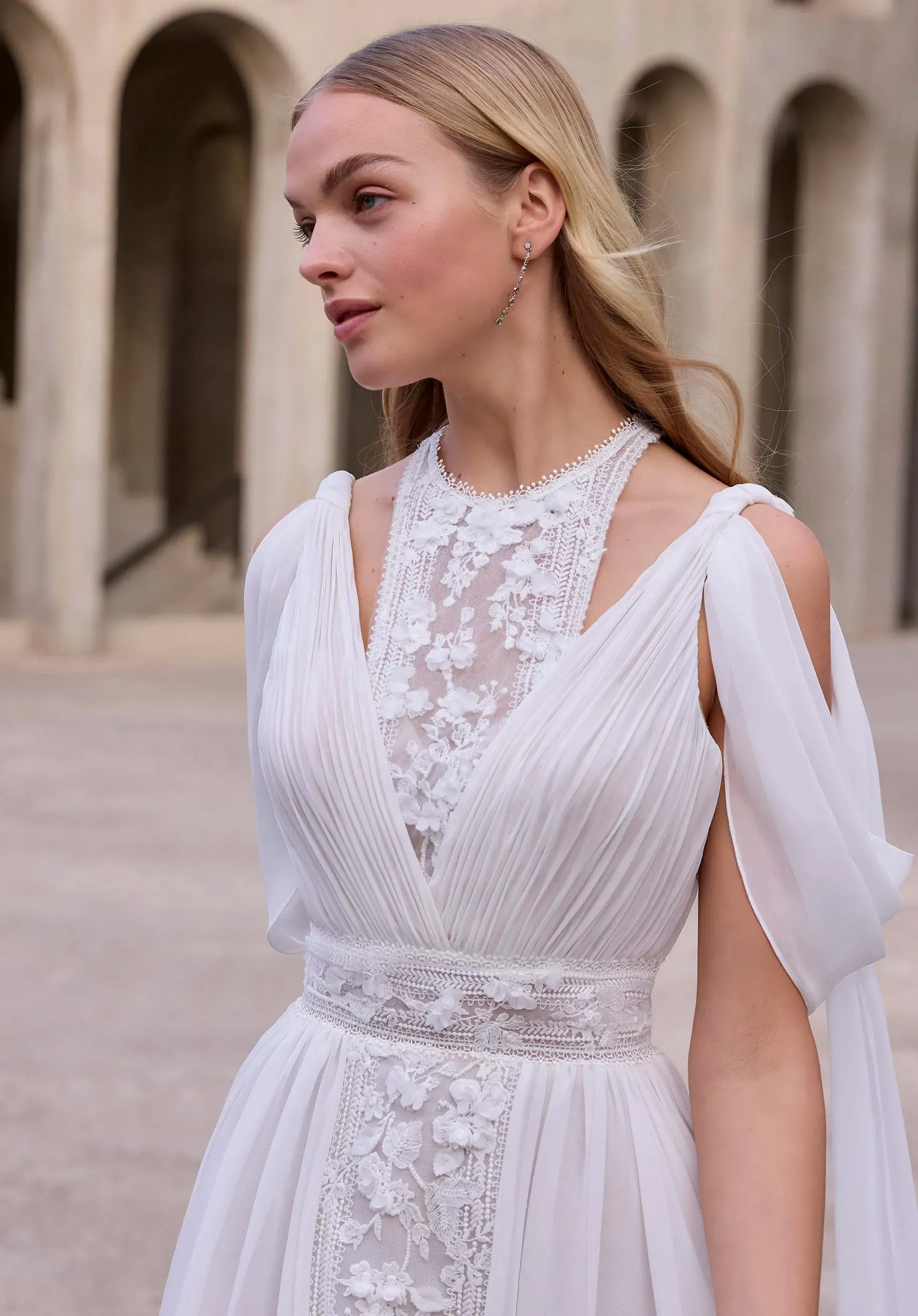 Soft romance in a modern silhouette, our Galene wedding dress features twisted chiffon straps that frame the v-neckline, while off-the-shoulder draped streamers float effortlessly for a touch of movement. Floral embroidered lace appliqués trace the bodice and banded waist, flowing into a chiffon A-line skirt with a gentle train for a gown for a dreamlike feel. Shown in Ivory/Honey.