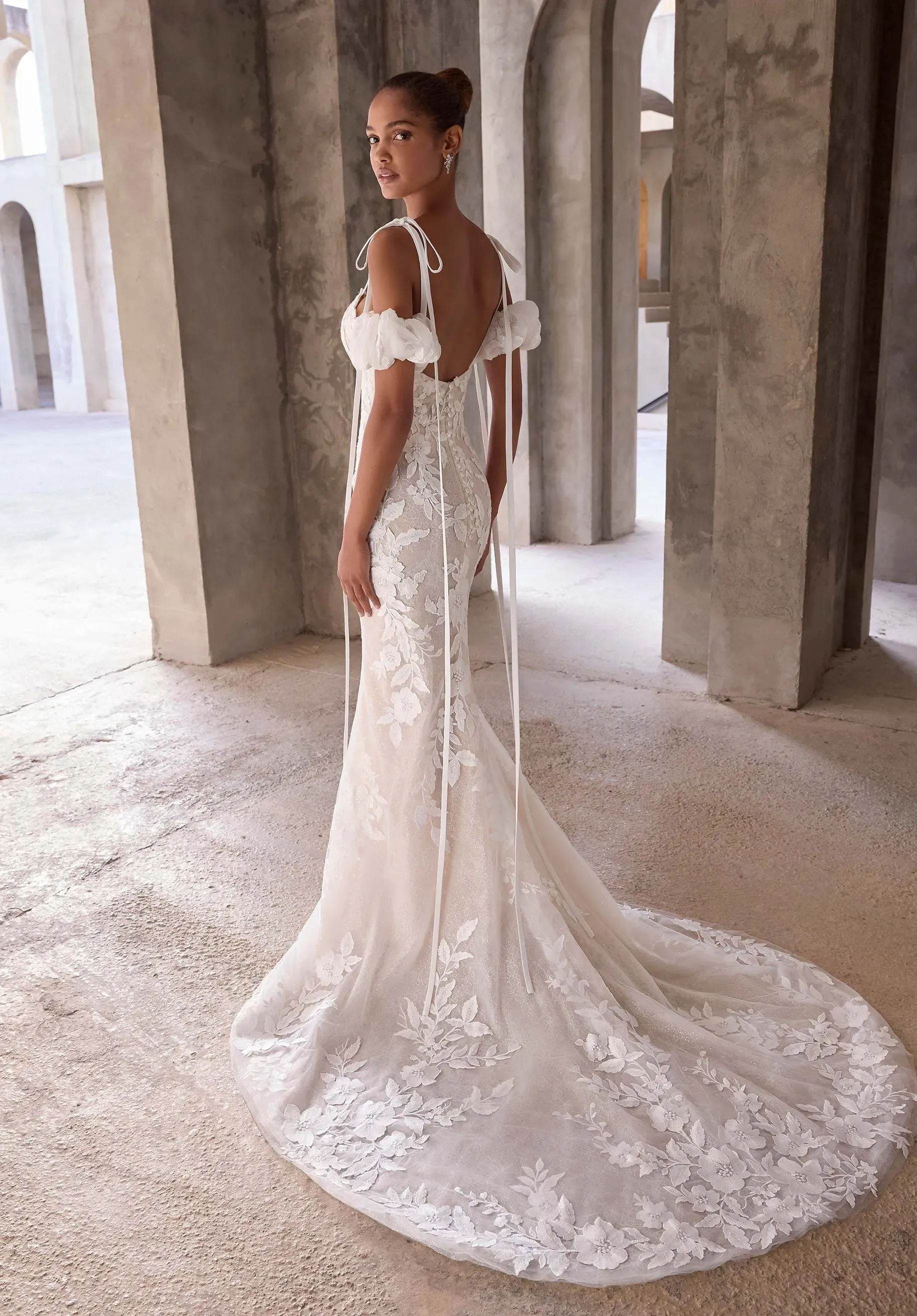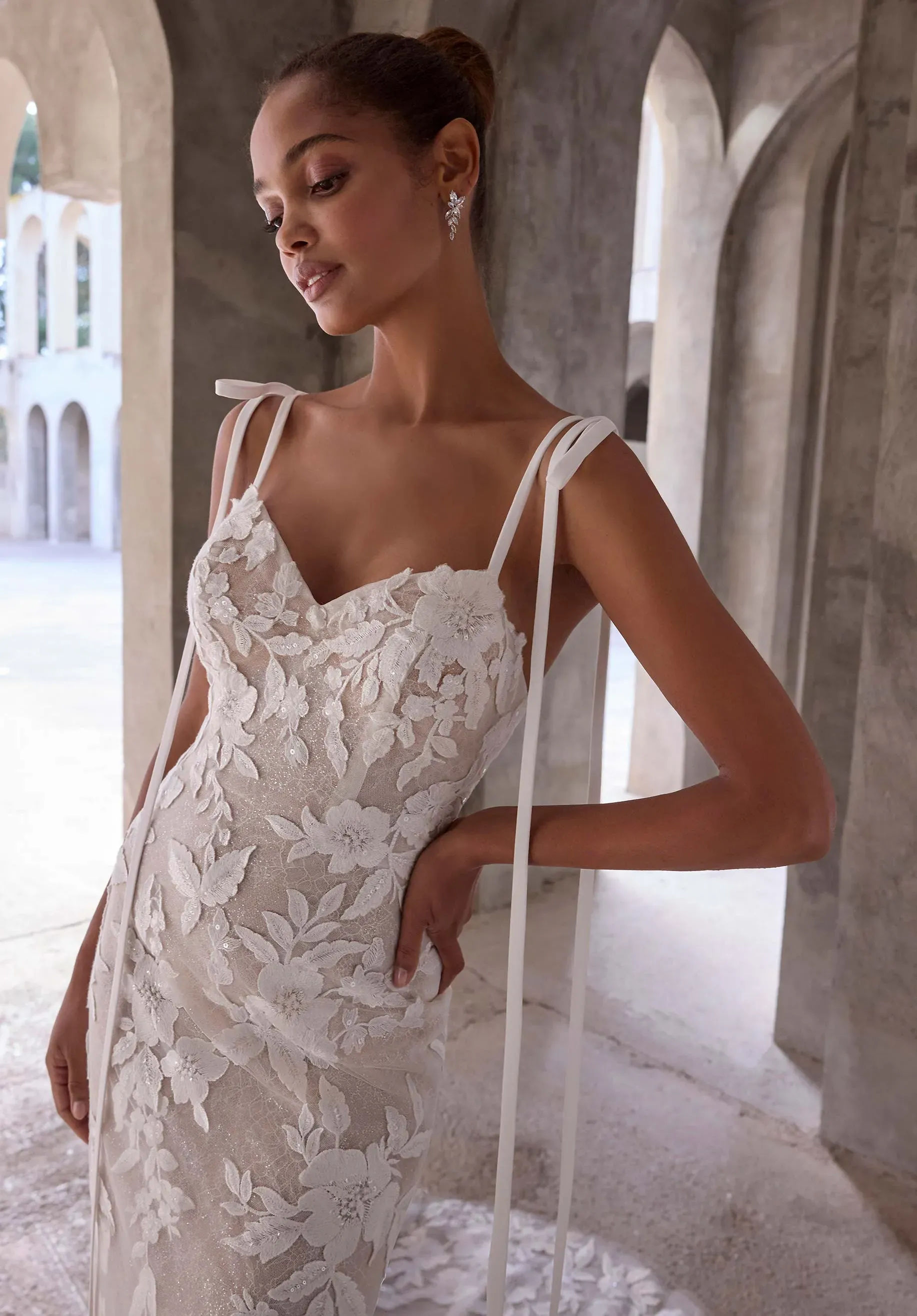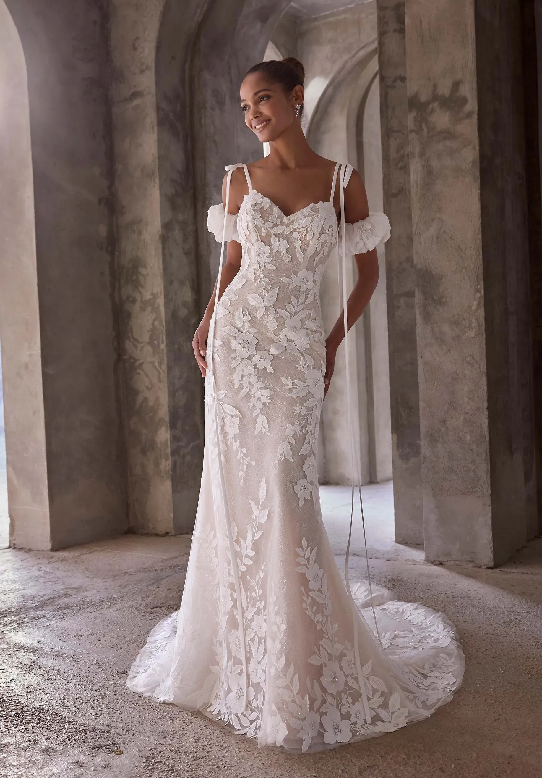 Whimsical with a modern edge, our Io wedding dress has a sweetheart neckline with dramatic, floor-length bow-tie straps and detachable organza puff sleeves for a customizable look. Threadwork floral appliqué trails along the fit and flare silhouette, complemented by a scoop back and chic chapel length train. Shown in Ivory/Honey.