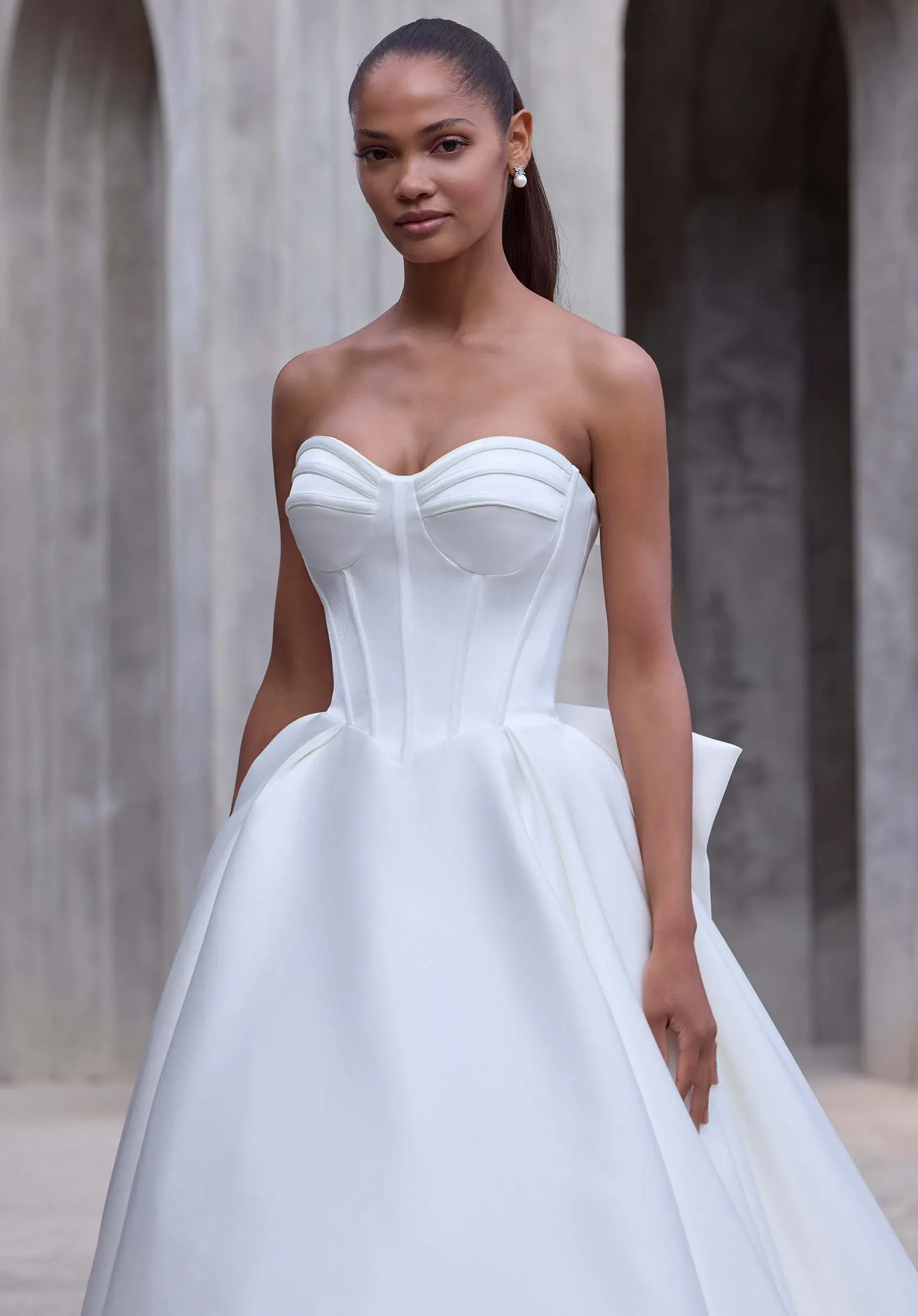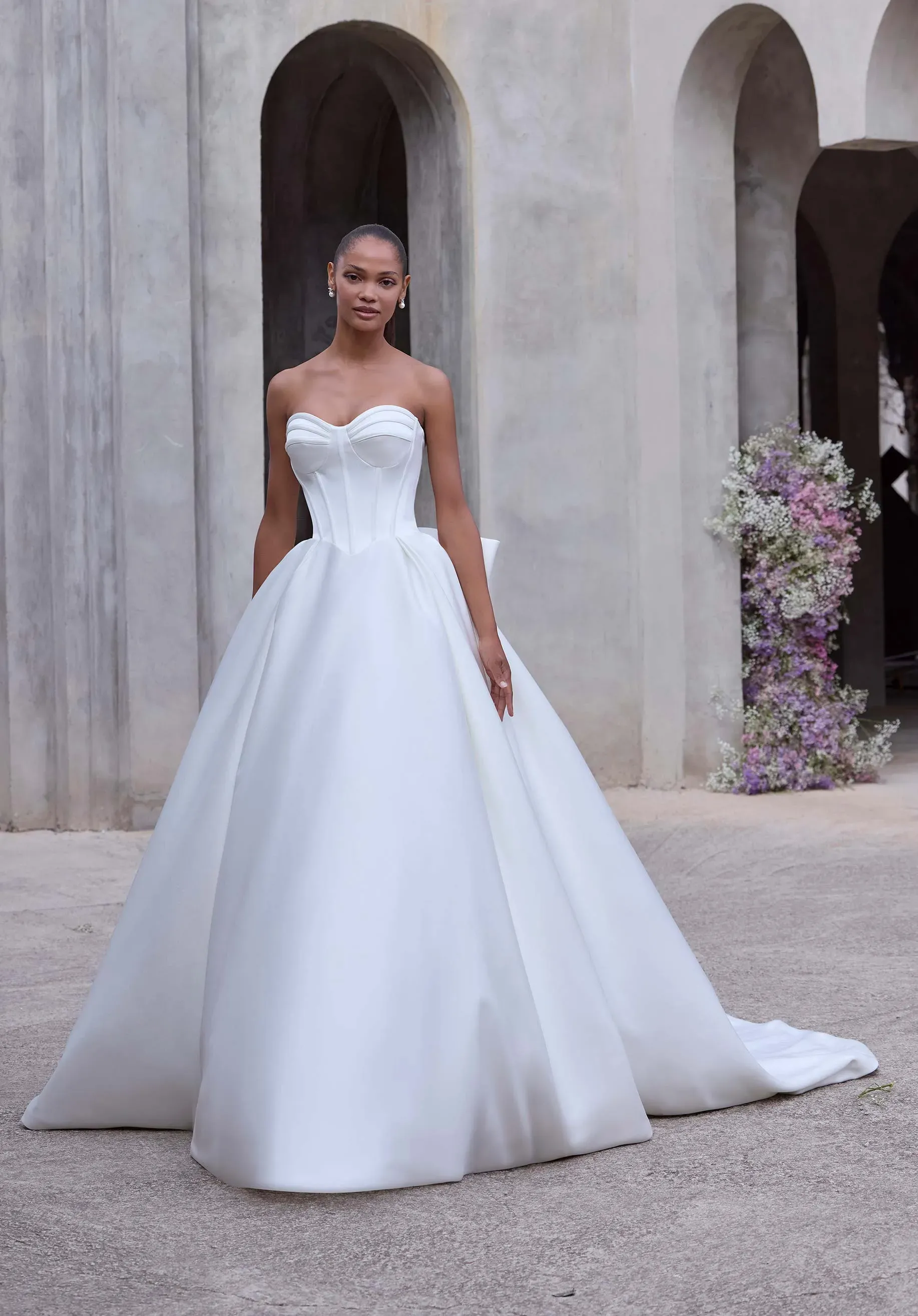 Structured in form, fluid in designer, our Athene wedding dress is a strapless ball gown that stuns with a sweetheart neckline and sculpted basque waist on a stylized boned bodice. Crafted in luminous crepe, the voluminous skirt flows into a sweeping train, while a detachable bow adds a refined, romantic finish.