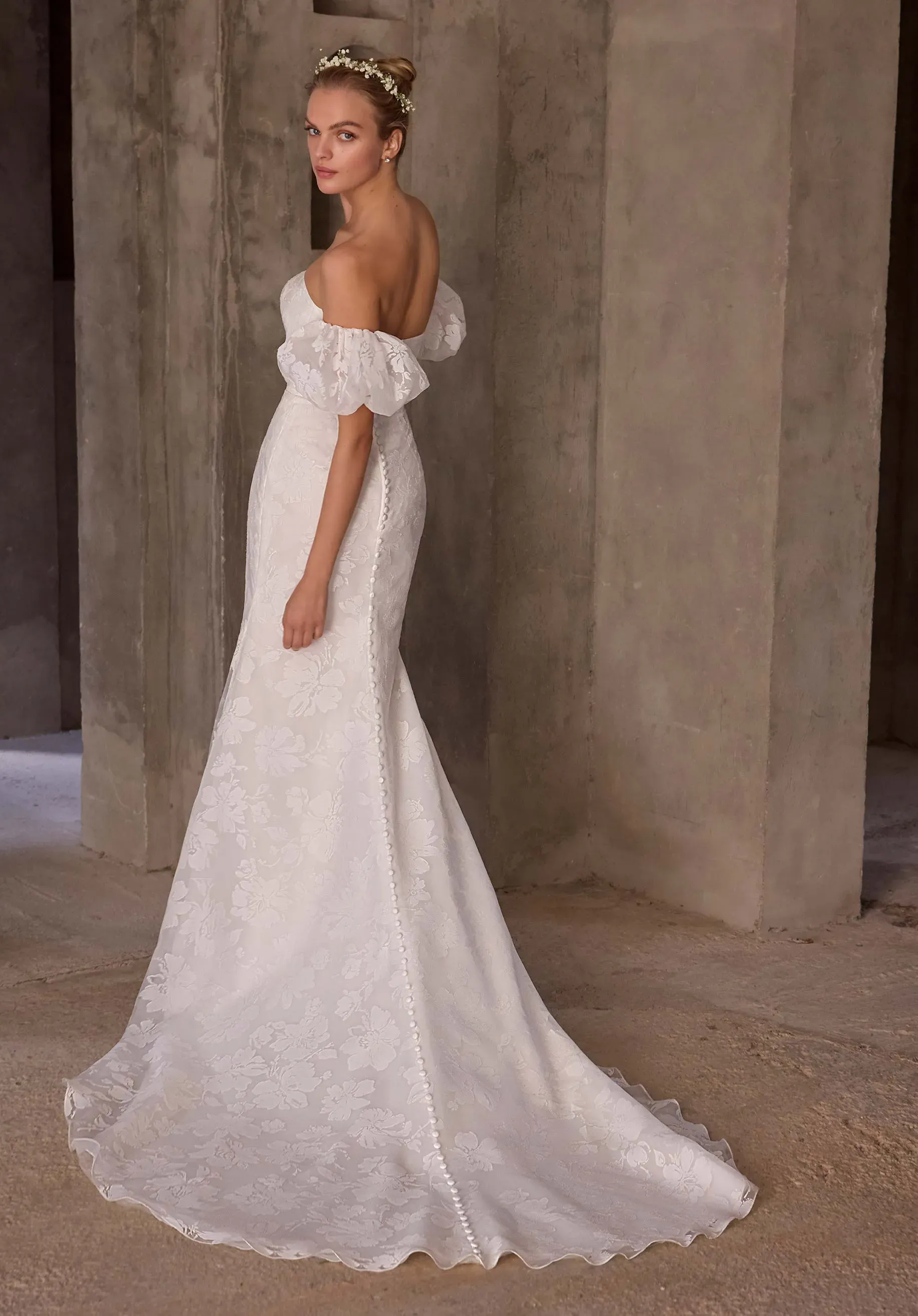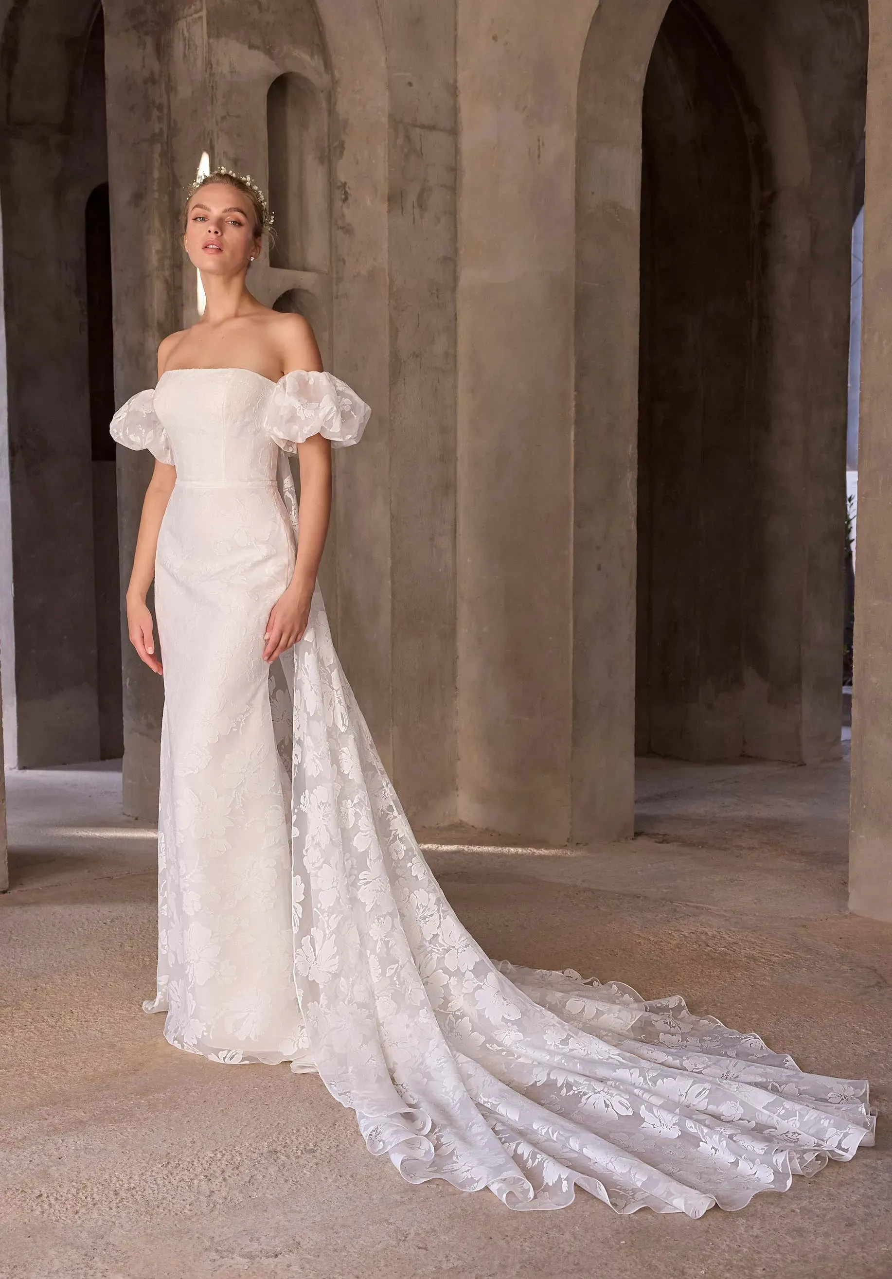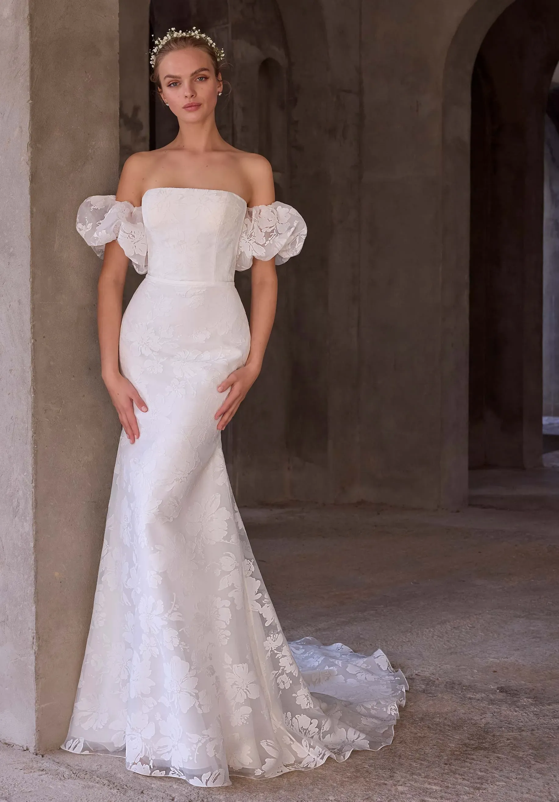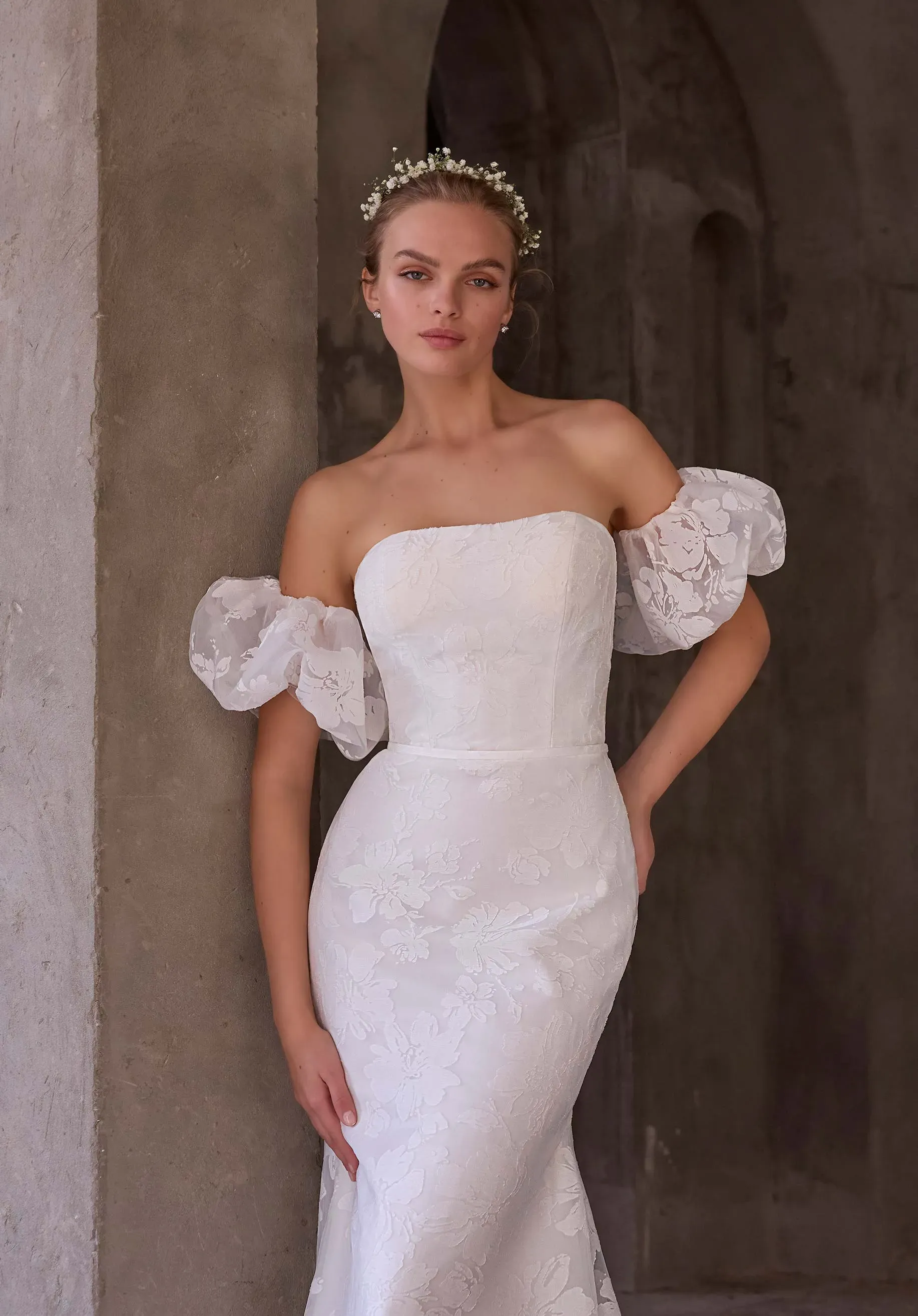 Airy and architectural, our Sen wedding dress is a strapless fit and flare gown crafted in ethereal burnout organza, sculpting the body with modern romance. Detachable puff sleeves add a soft, editorial edge, while a sweeping watteau back lends dramatic movement for a look that shifts seamlessly from ceremony to celebration. The dress is available without the puff sleeves and watteau back as Style 2976D.