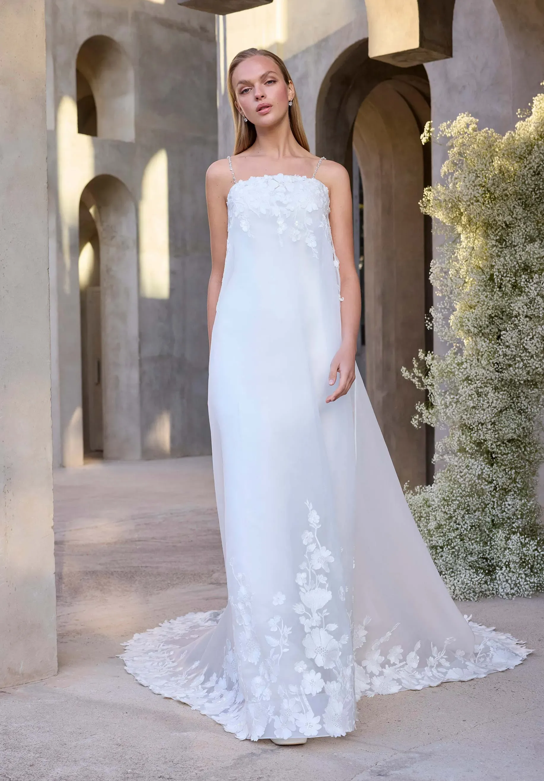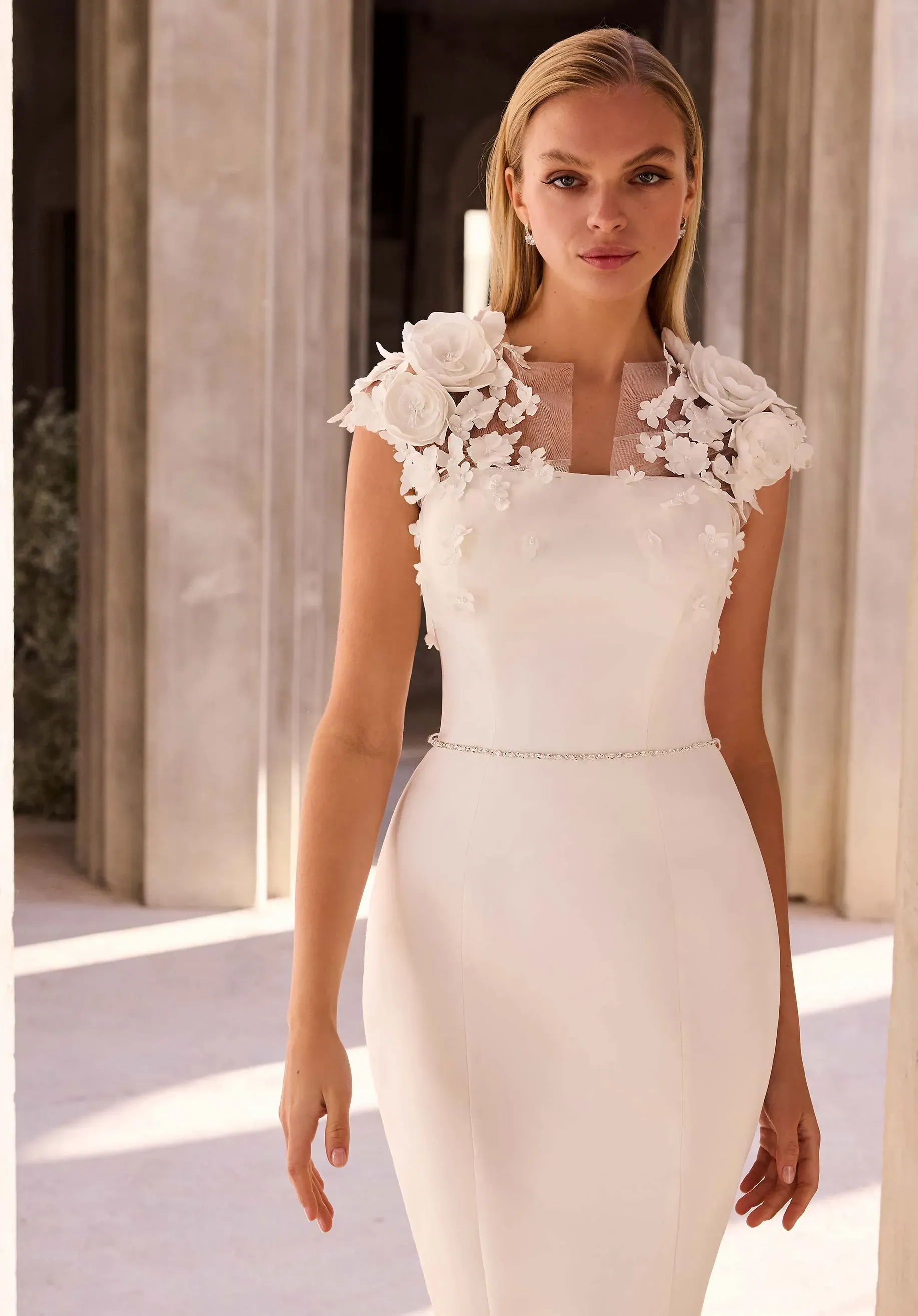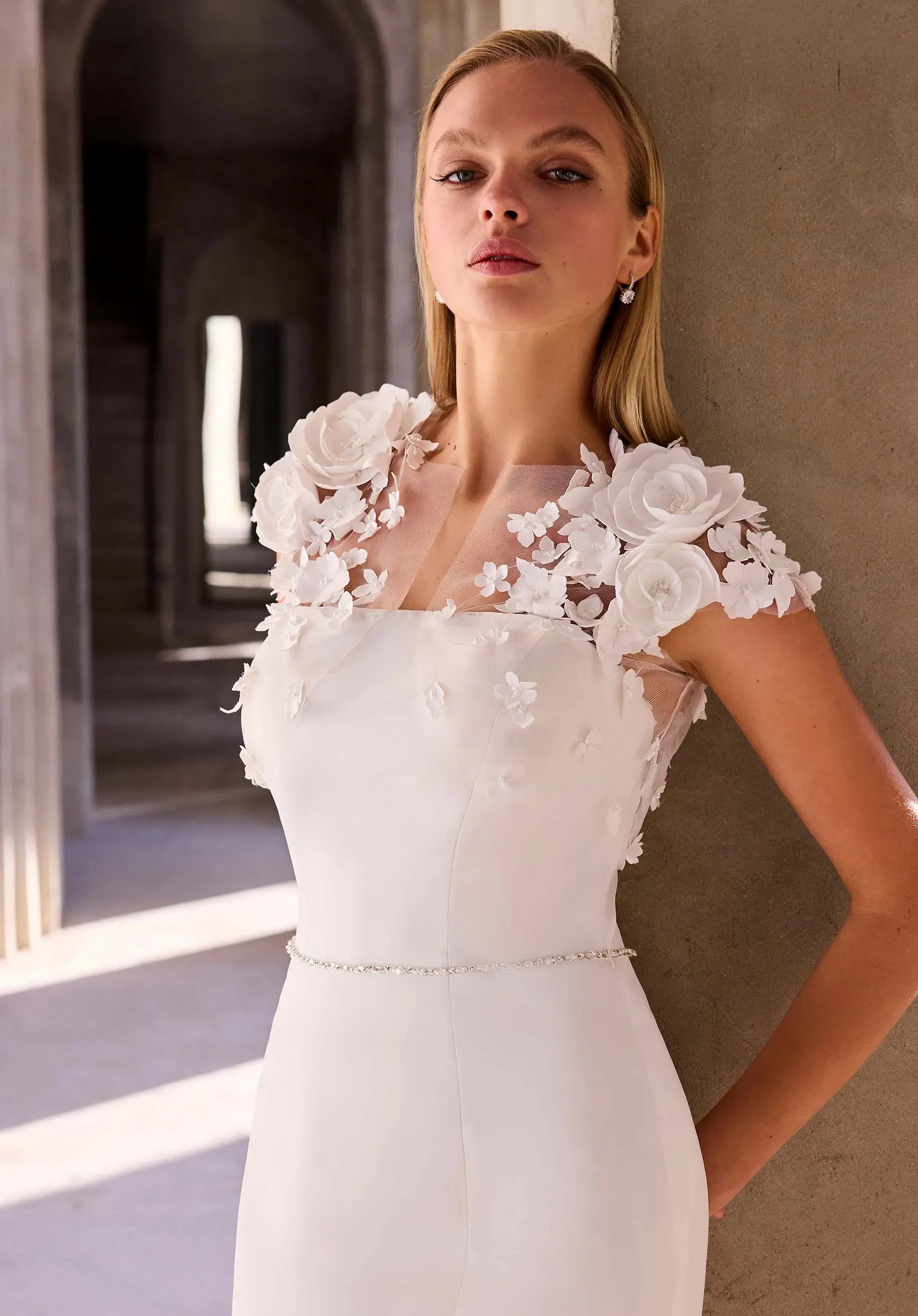 Sleek sophistication meets ethereal detail in our Calandra wedding dress. The satin column gown is anchored by shimmering crystal straps and a detachable crystal waistband defines the silhouette. An embroidered netting overlay adds a layer of delicate texture and soft movement. The look is modern, minimal, and quietly radiant—perfect for a bride who embraces understated glamour. Styled with 3D Floral Tulle Bolero sold separately as Style 11630. The dress is available without the net overlay as Style 2978D.