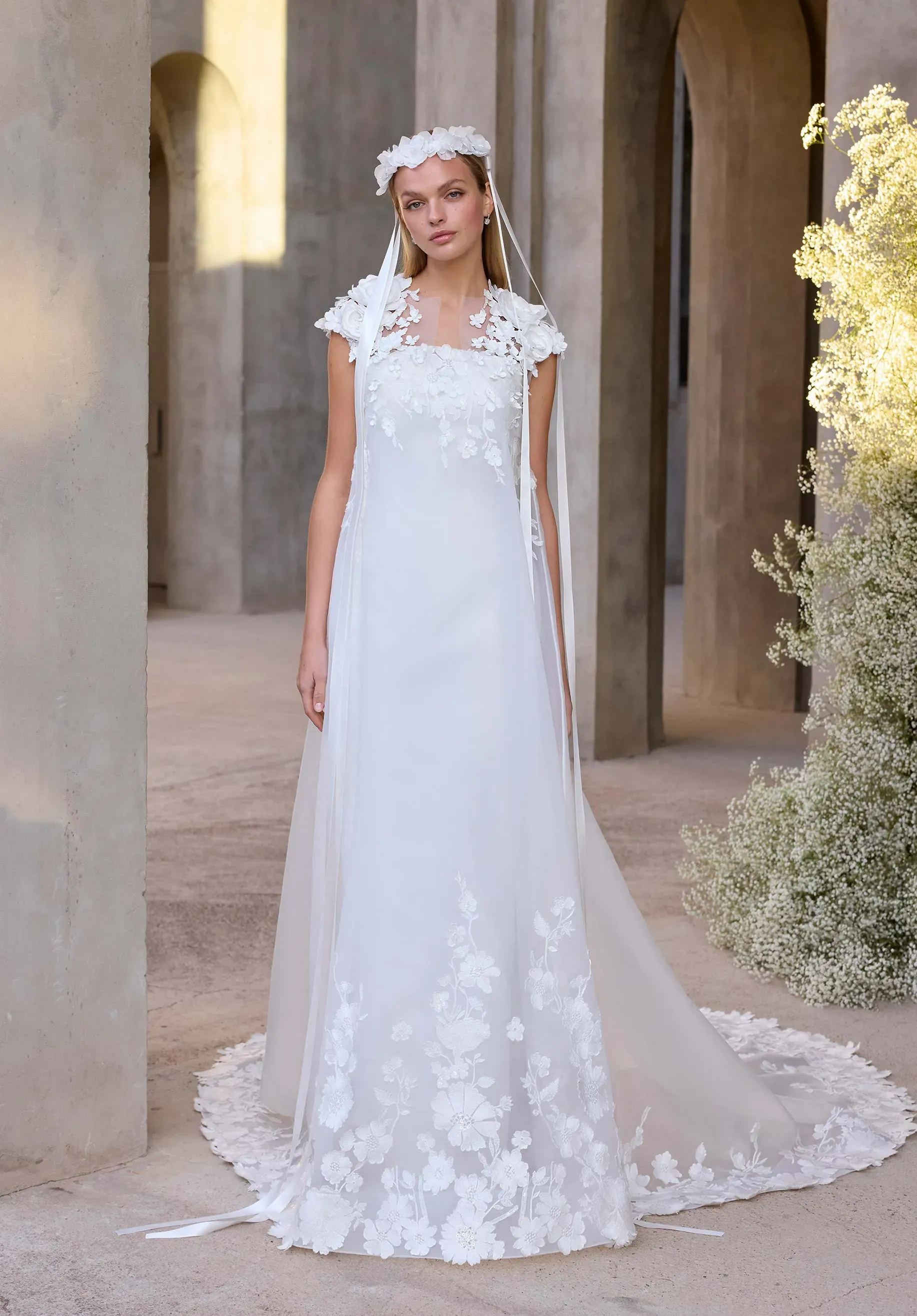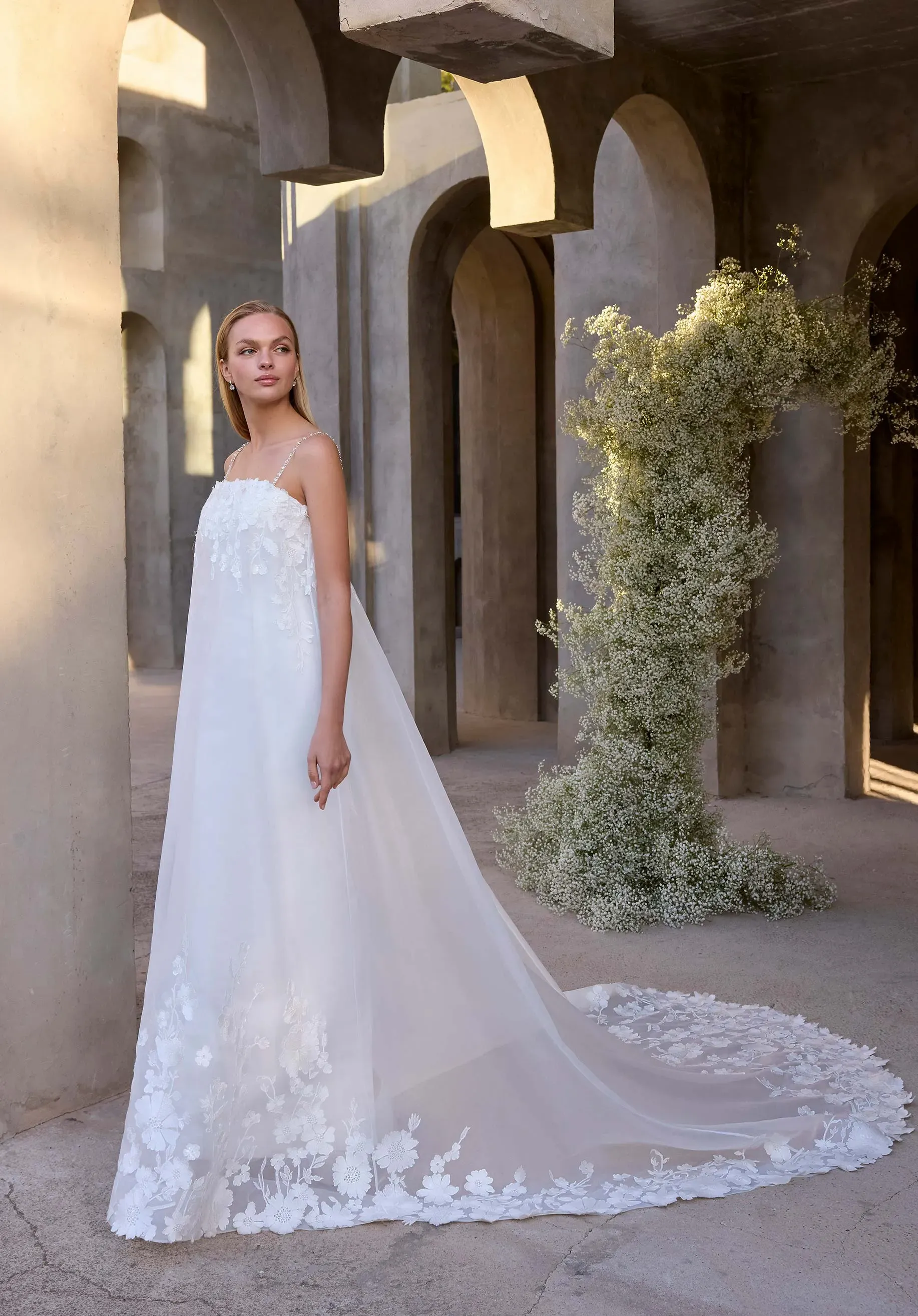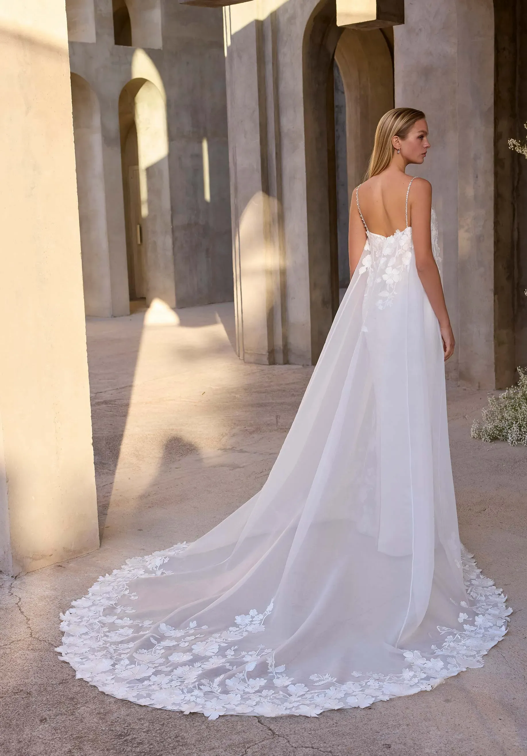 Sleek sophistication meets ethereal detail in our Calandra wedding dress. The satin column gown is anchored by shimmering crystal straps and a detachable crystal waistband defines the silhouette. An embroidered netting overlay adds a layer of delicate texture and soft movement. The look is modern, minimal, and quietly radiant—perfect for a bride who embraces understated glamour. Styled with 3D Floral Tulle Bolero sold separately as Style 11630. The dress is available without the net overlay as Style 2978D.