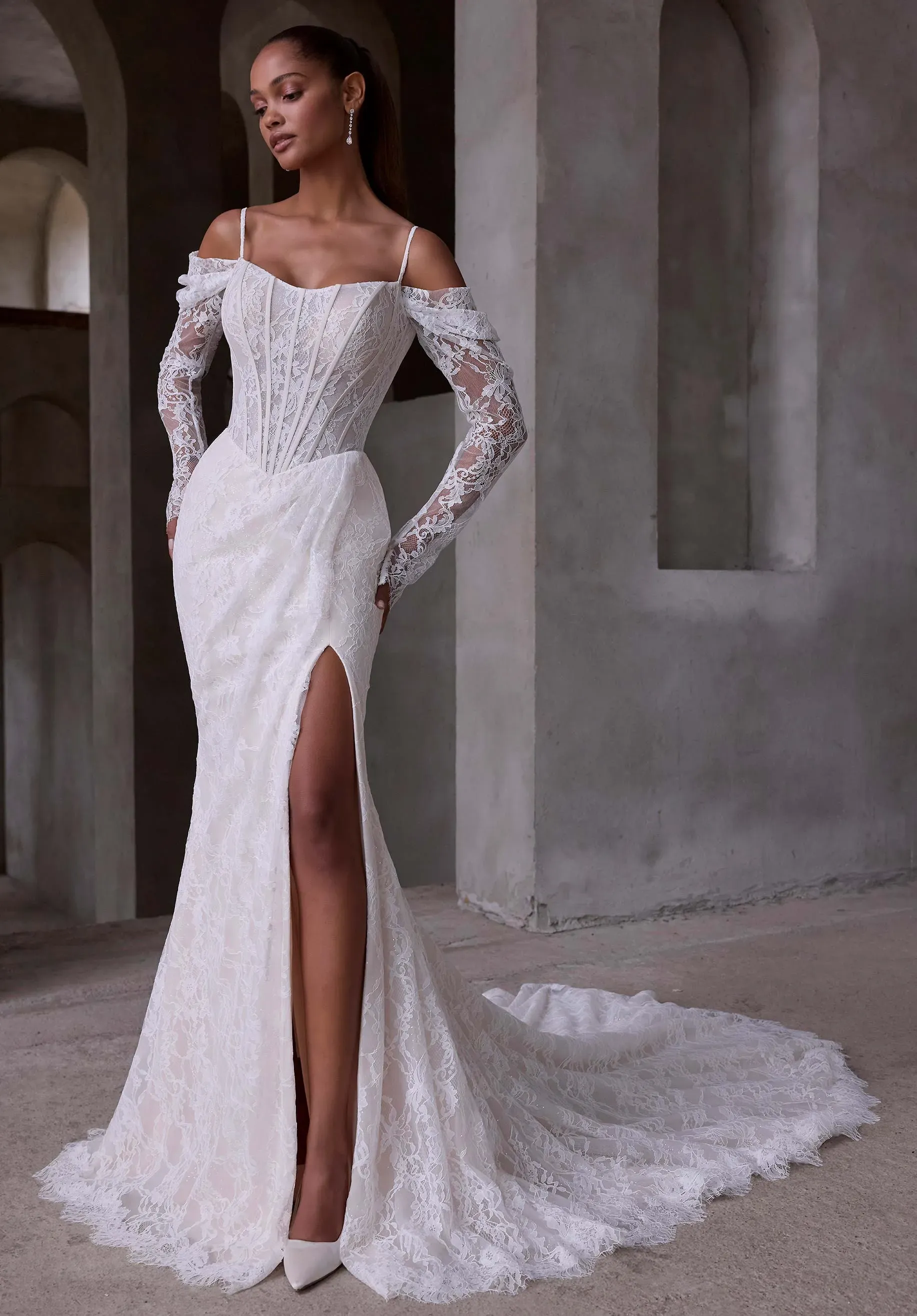 Our Leto wedding dress is contemporary vision of romance. The scoop neck fit to flare gown stuns with delicate thin straps and a structured corset bodice with a lace-up back for a custom fit. Designed in lace over shimmering glitter tulle, it features a thigh-high slit and sweeping train for dramatic movement. Detachable draped lace sleeves offer a soft, ethereal finish to this modern bridal look. Shown in Ivory/Champagne/Honey. Draped Lace Long Sleeves also sold separately as Style 11620.
