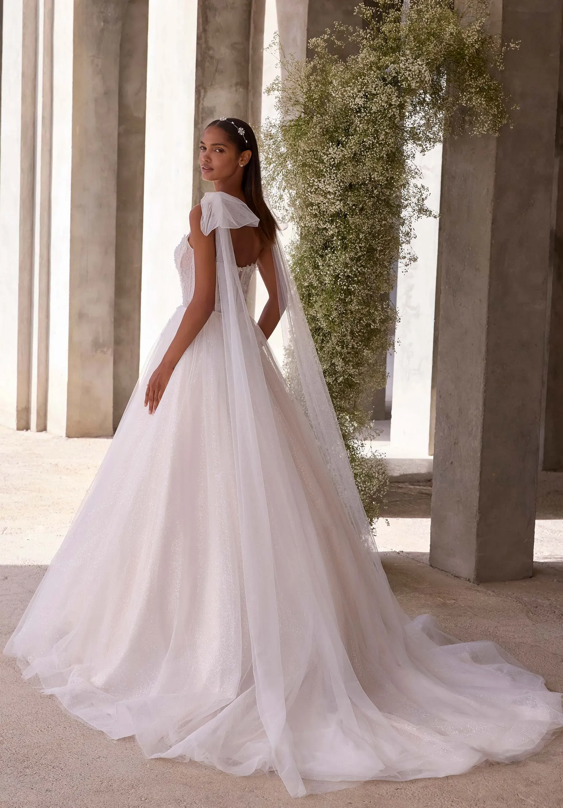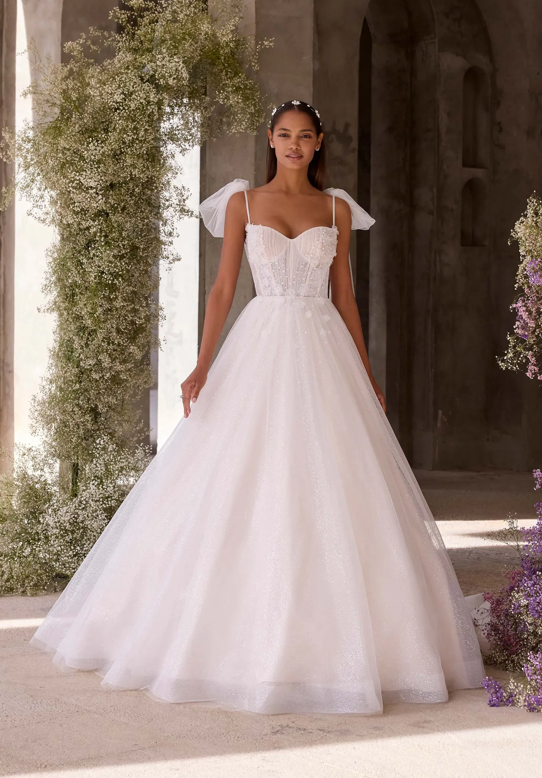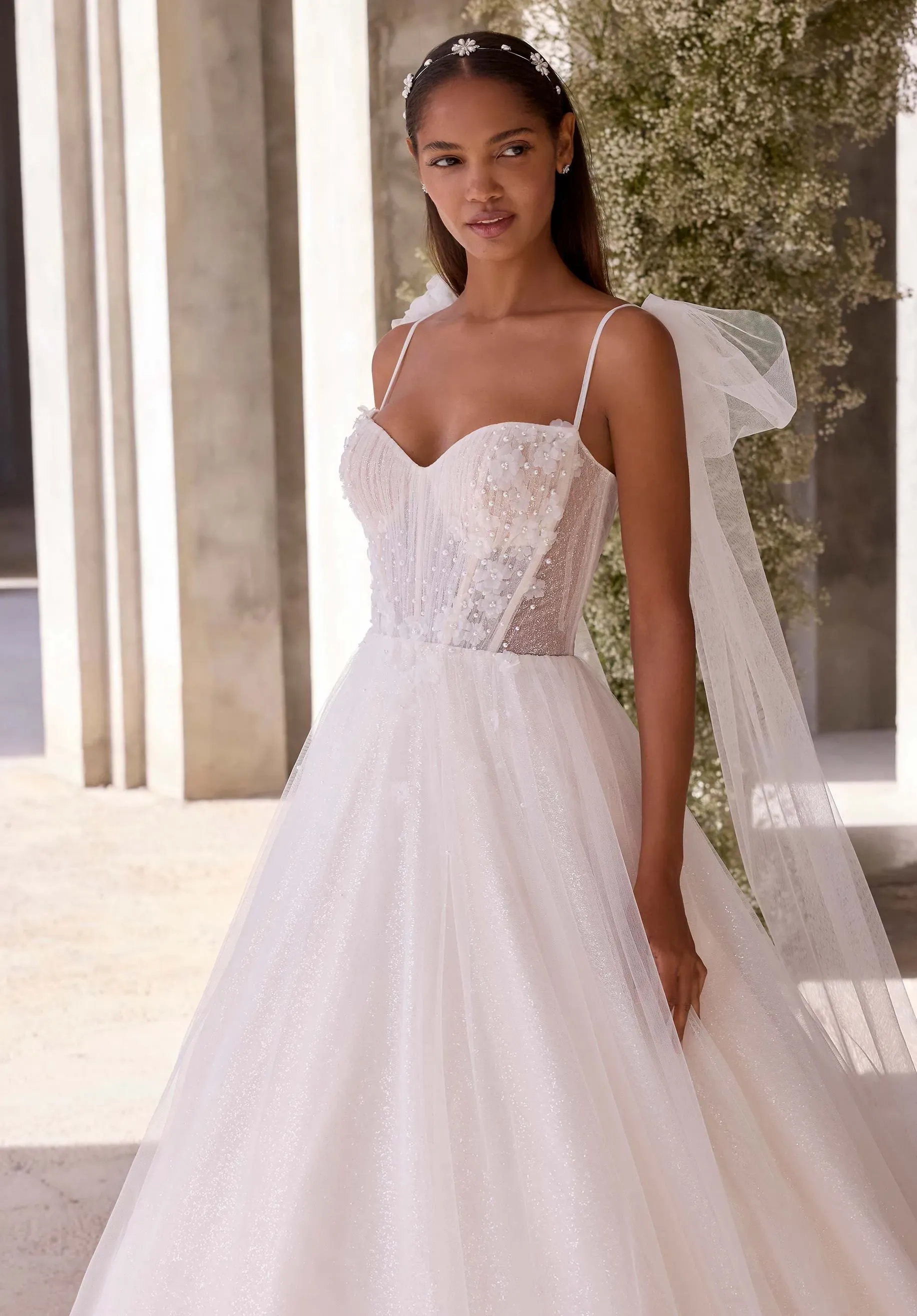 Ethereal and effortlessly feminine, our Loraline wedding dress is an A-line gown featuring a sweetheart neckline and floor-length organza tie bow straps that frame the shoulders with soft drama. A pleated bodice with exposed boning sculpts the silhouette, while floral appliqué dances across layers of glitter tulle for a romantic shimmer. Finished with a sweeping train, it's a modern fairytale come to life. Shown in Ivory/Champagne.