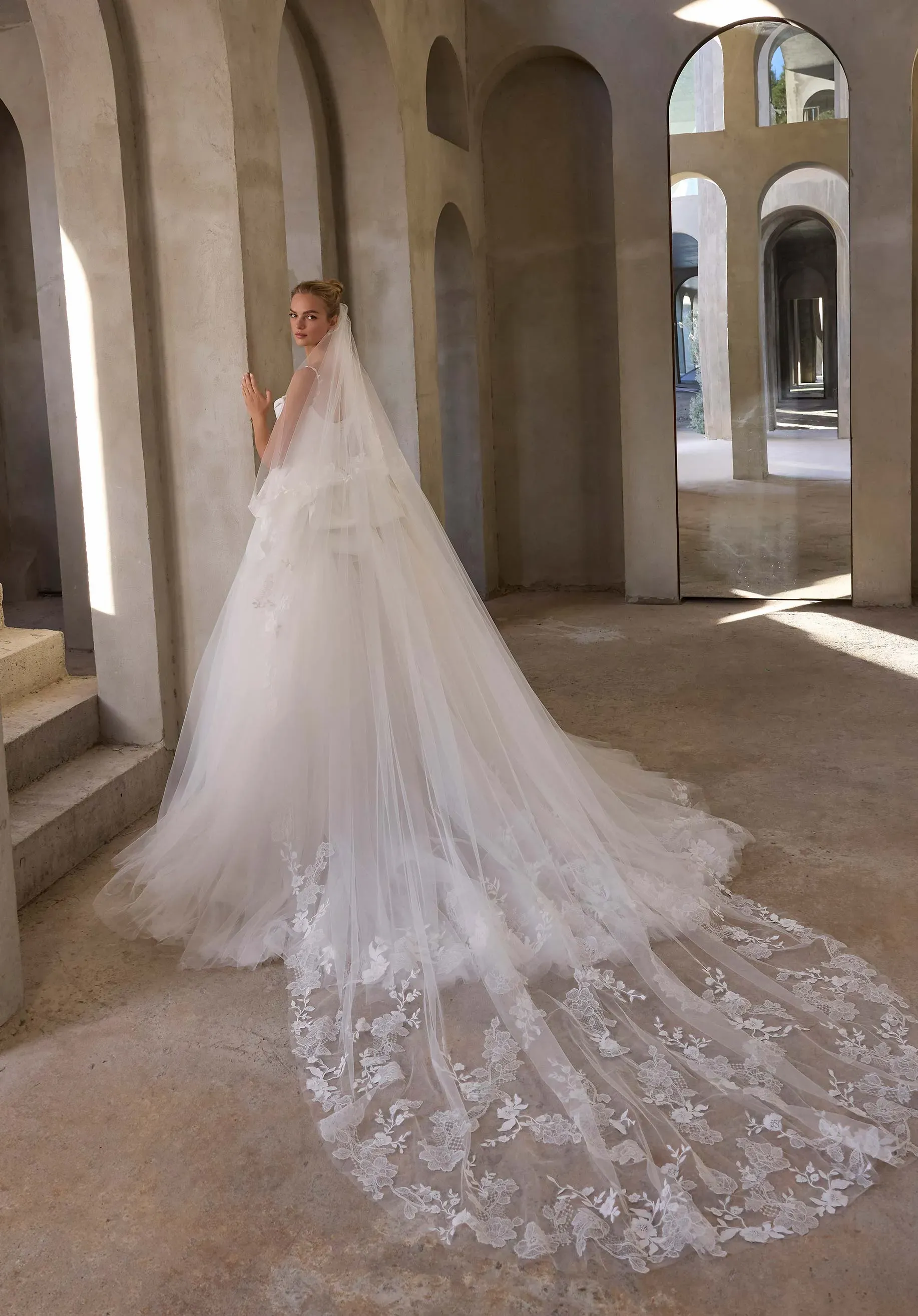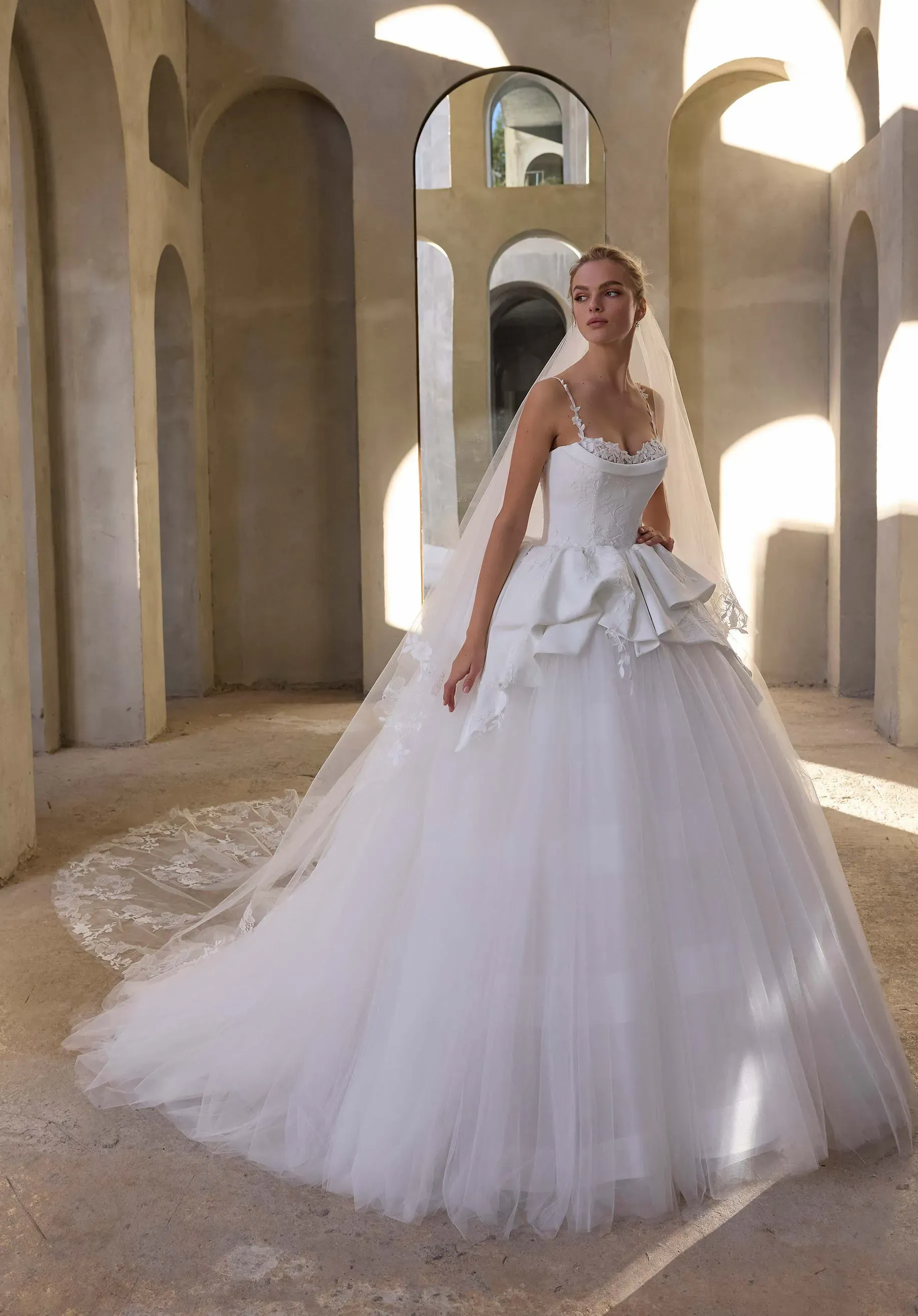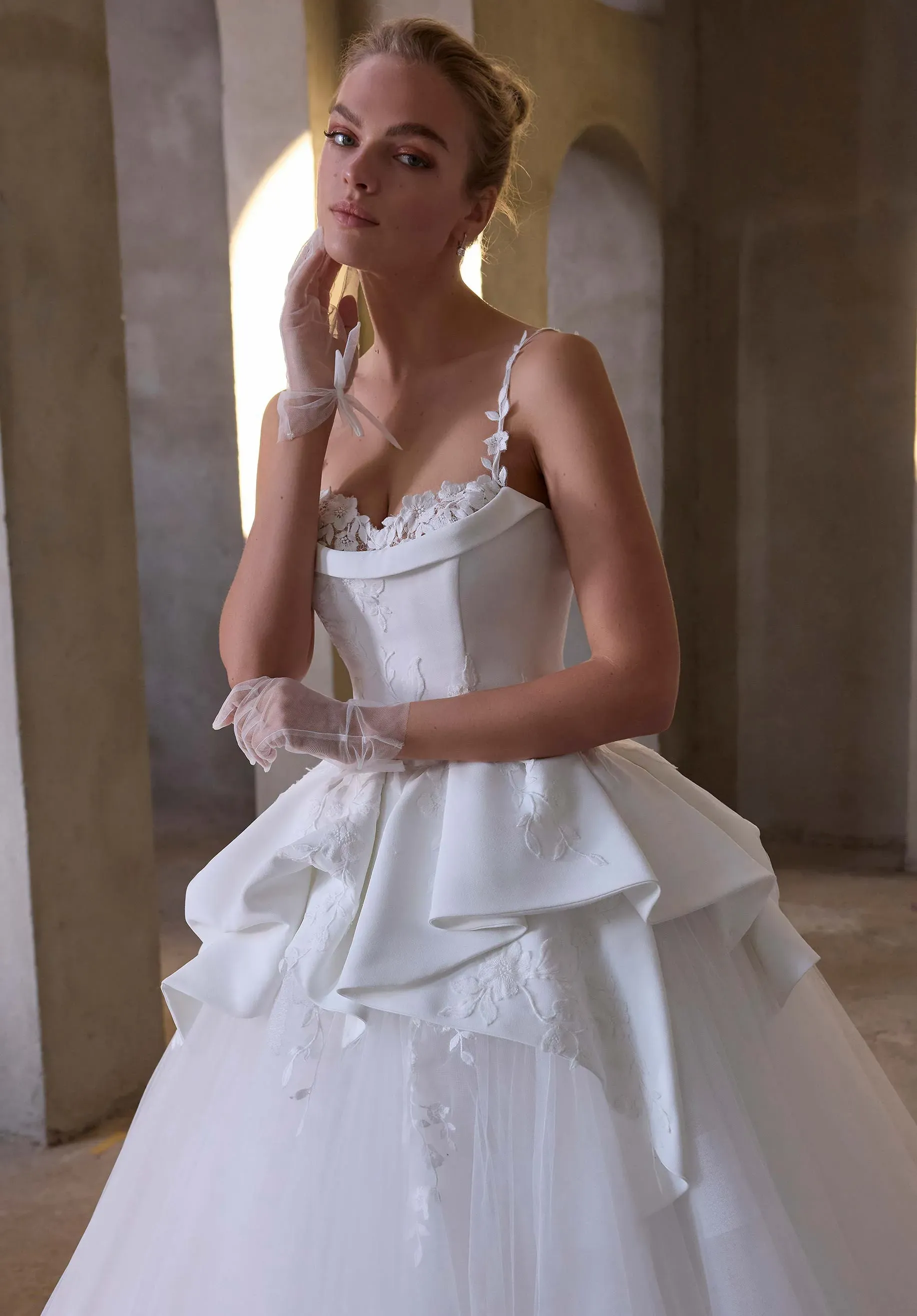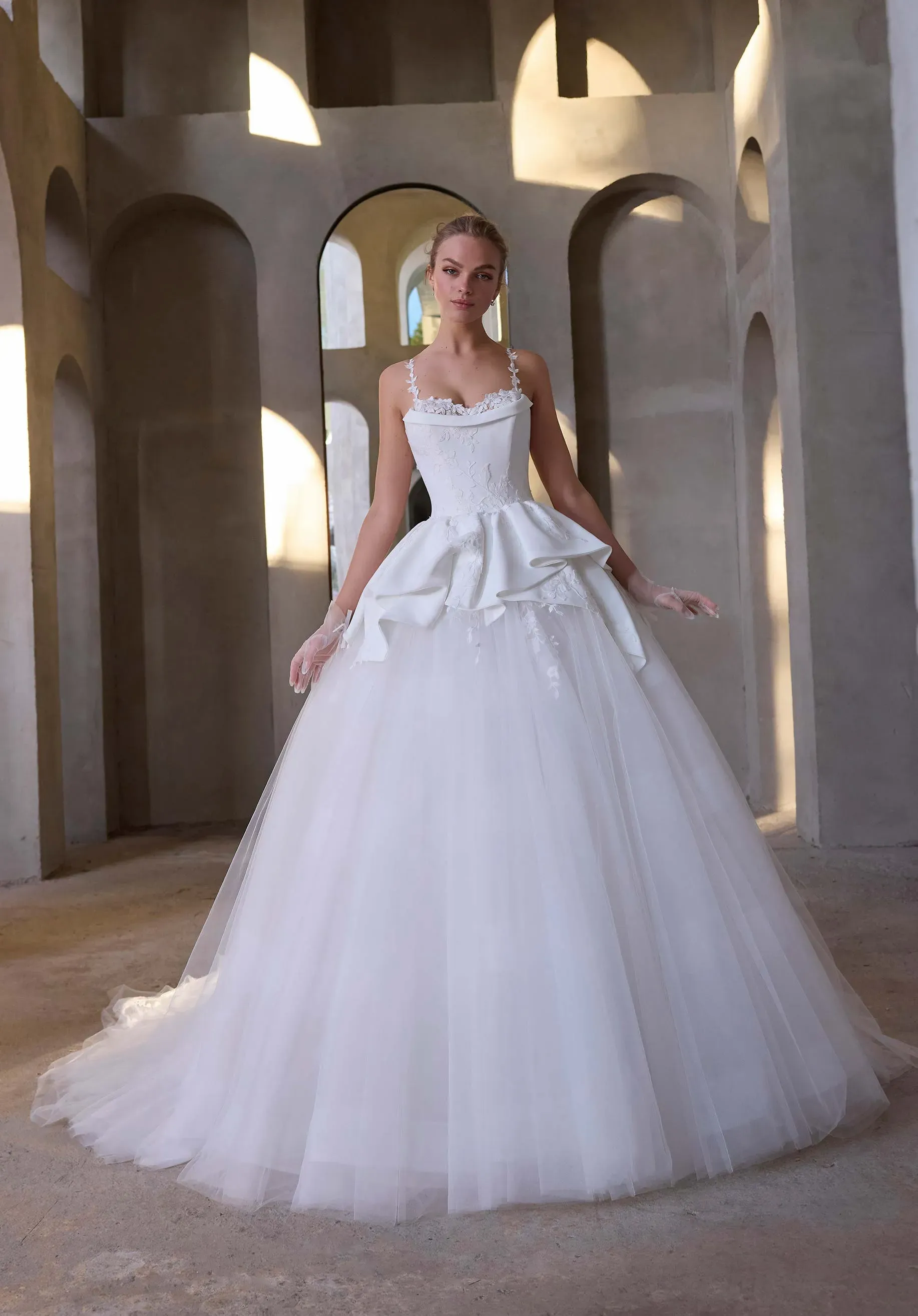 Our Lilah wedding dress is effortlessly modern with a romantic twist. The tulle ball gown captivates with a softly draped crepe bodice and sculpted sweetheart neckline framed by delicate thin straps and cuffed detail. A textural peplum adds dimension at the waist, while floral appliqués bloom across the voluminous skirt, creating a graceful movement that feels both ethereal and editorial. Styled with matching Floral Appliqué Tulle Cathedral Veil sold separately as Style 2993V.
