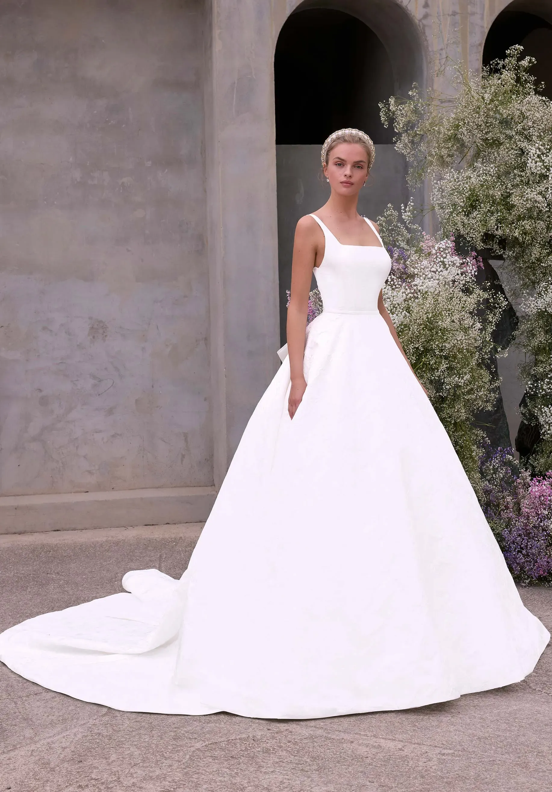 A gown that serves modern sophistication, our Eowyn wedding dress is a striking ball gown showcasing a clean square neckline and slender straps designed luxe mikado fabric. The voluminous skirt flows into a graceful train, while a detachable bow adds a touch of versatile elegance.