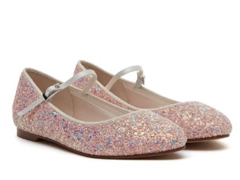DESCRIPTION Pretty, sparkly and lots of fun, River is a beautiful bridesmaid shoe in our Kid's Collection. Crafted from pink glitter, these simple ballet pumps have a silver trim and a skinny satin strap across the foot fastening with a matching silver buckle. Pretty in pink and not short on sparkle, any bridesmaid will love wearing these for the day. Please note, that due to its shimmer, River is a non-dyeable style. Sizes 12-5 Heel height: 1cm / 1/2"